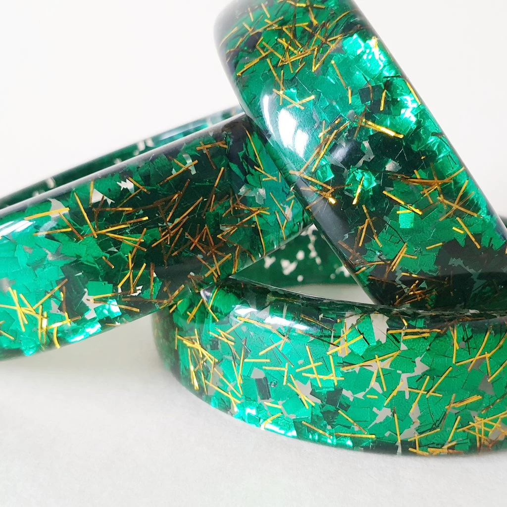 The stunning glam reproduction Billie lucite confetti bracelet in shade Mojito. Ready to FEEL expensive & waltz down the stairs, cocktail in hand? Inspired by classic vintage Clamper bracelets – this keep as close to original confetti inclusions as possible.