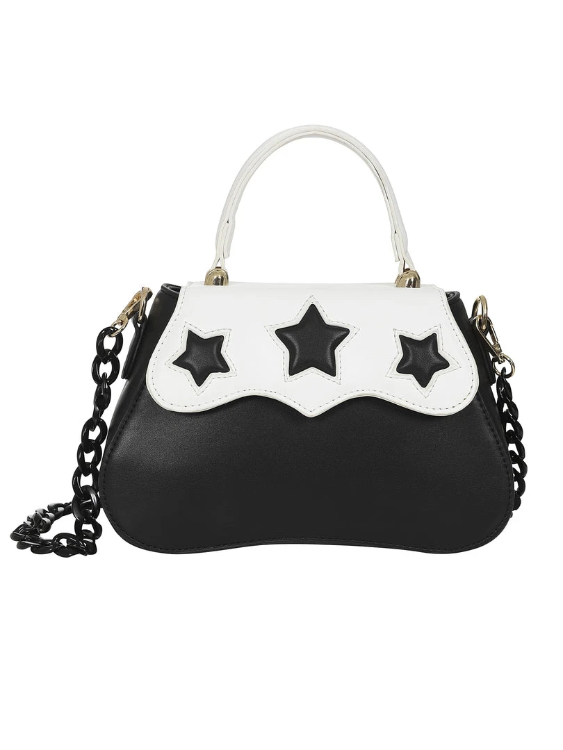 We’ve gone all starry-eyed over our Sonia Star Bag! She’s a monochromatic style, coming in black with a white, western-style fold-over flap, which features three padded black stars. She’s made from soft PU and has brass coloured metal fastenings. She fastens via a popper button on the flap and a zipper underneath. Her black, metal chain shoulder strap is removable, and she has a white PU top handle as well.