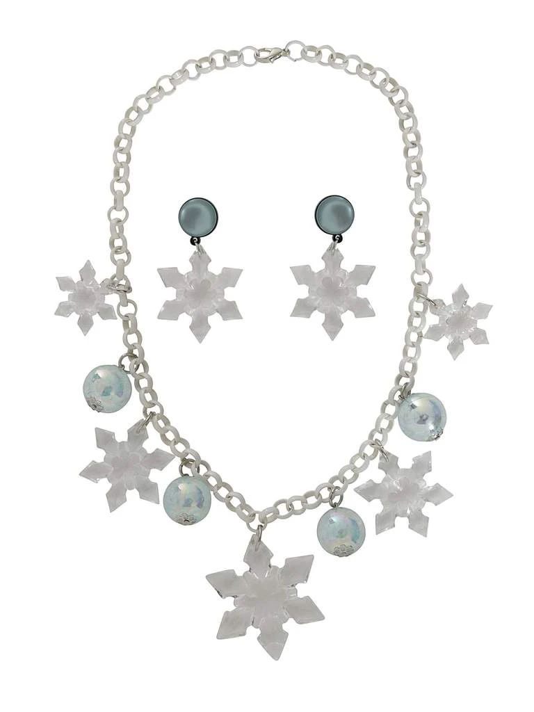 Look no further than this ethereal beauty for a true statement necklace and earring set this winter. The Aster Winter Necklace Set has a chunky white chain and features large snowflakes with shimmery, pearlescent detail and shiny baby blue metallic baubles, and her earrings have one snowflake each attached to an adorable metallic blue dome on the ear.