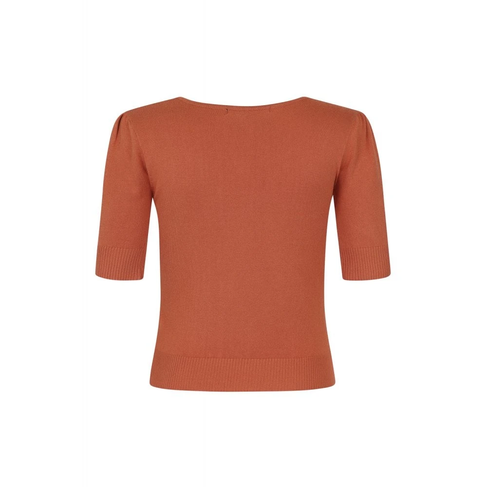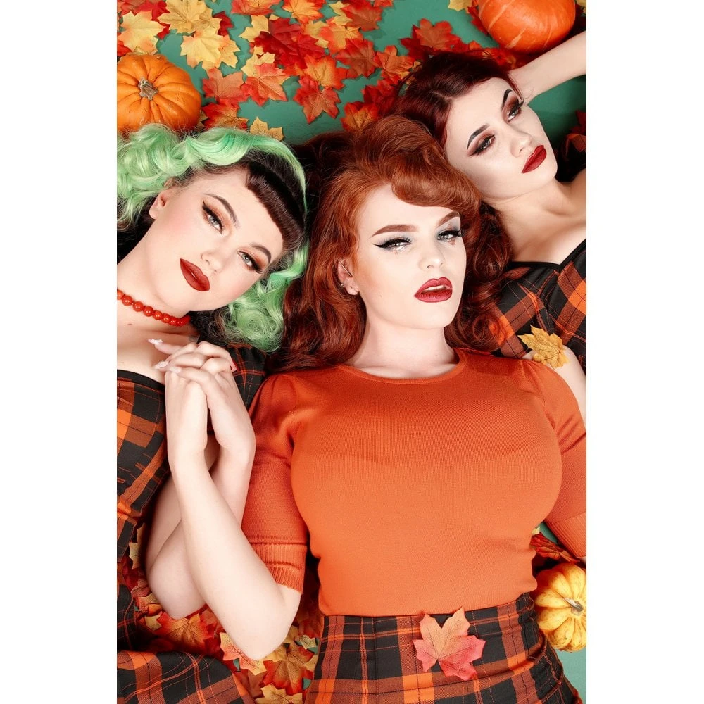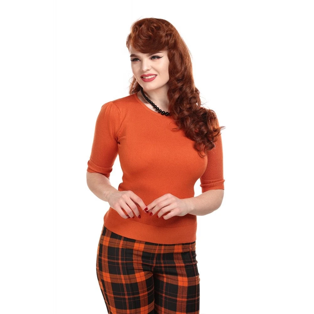 The Chrissie Plain Knitted Top is a fabulous 50s inspired piece. She is a hip length top, with elbow length puffed sleeves, and a round neckline. Made from a soft yarn, Chrissie is a lightweight knitted top in this lovely burnt orange. Chrissie pairs perfectly with the Poppy Jacket and matching Victoria Trousers or with the delightful Marilu Leaves Border Print Skirt.