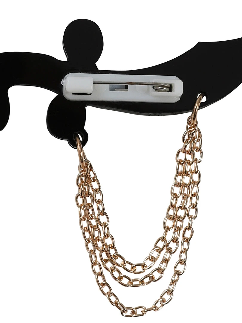 This curved sword, resin brooch, is painted in metallic silver paint, with a black handle. Three gold coloured, small link chains hang from the piece. It fastens via a safety pin. Perfect for a 40s inspired look.
