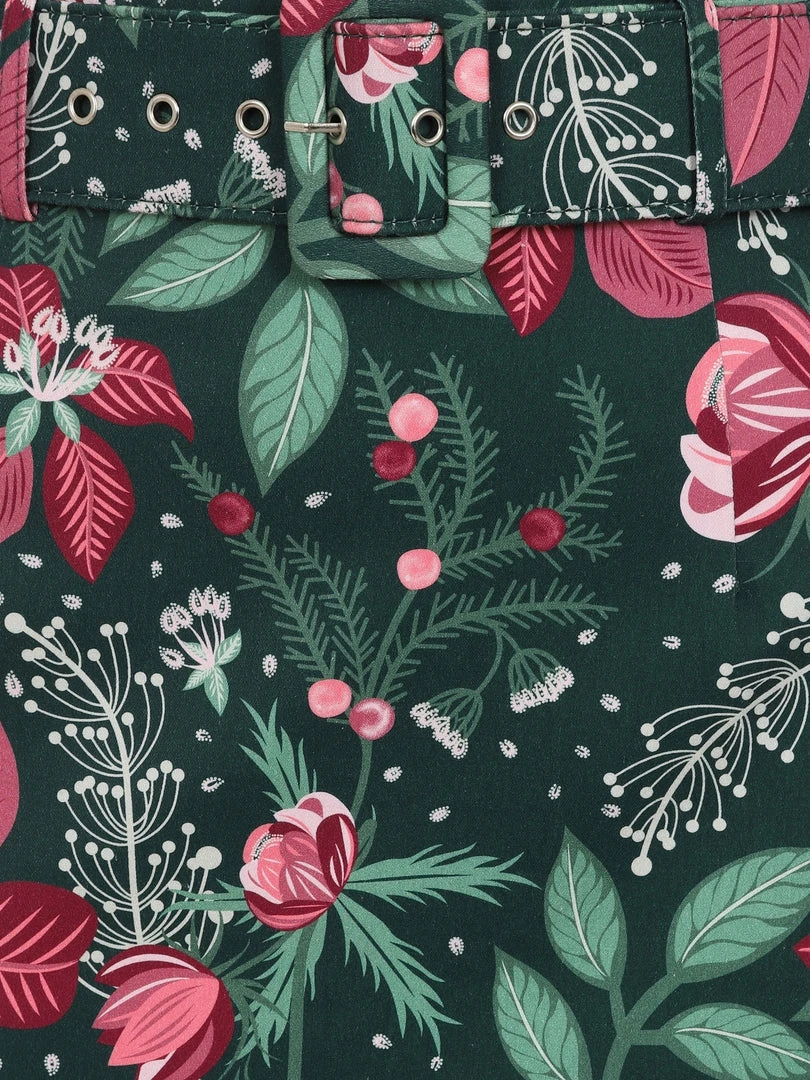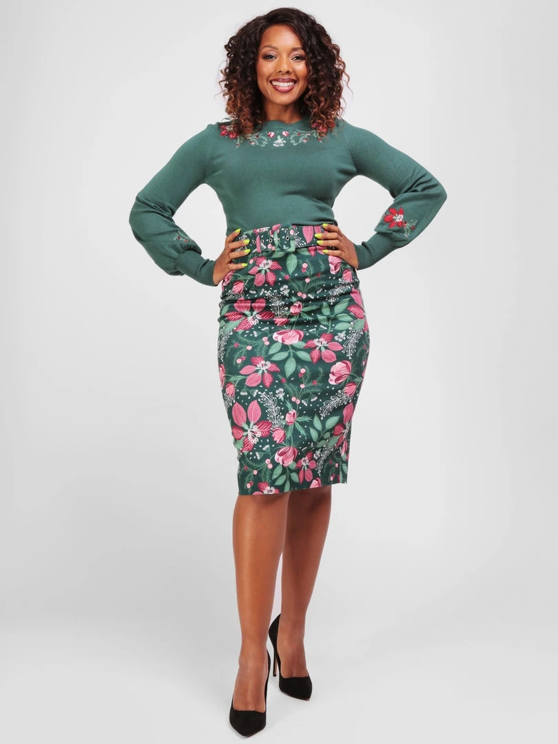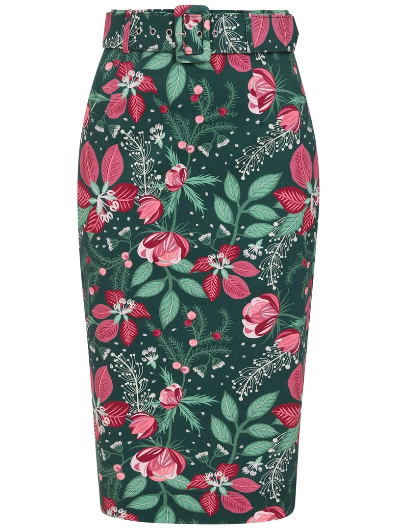 This bright and vibrant style is the Juanita Escapist Floral Pencil Skirt! It comes in a pretty print of vibrant pink flowers with luscious foliage and white highlights, all on a gorgeous green background. It fits to the natural waist, and includes a wide, matching PU backed belt with a retro inspired square buckle. It’s hemmed approximately at the knee with a vent at the back for movement. It fastens at the back with a covered zip.
