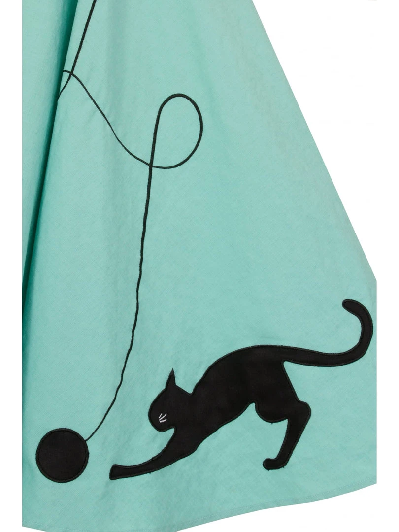 She’s as cute as a kitten! Maybe even multiple kittens! The Kitty Cat Swing Skirt is an adorably playful swing skirt full of swinging whit and mischievous behaviour! She features a large embroidered kitty cat motif that follows a twisting, twirling ball of yarn that stretches up towards her waistline. Kitty comes complete with a gorgeous wide waistband that sits at the natural waistline and a chunky black belt pulling in and accentuating both your hips and waist. Finishing just past the knees, and fastening with an auto-lock zip, she’s made from our favourite cotton stretch fabric making her super breezy and flexible.