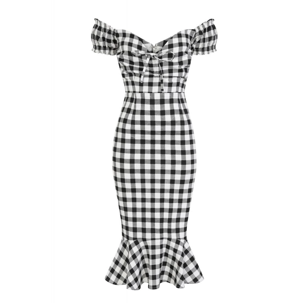 Channel sassy siren vibes with our Sasha Vintage Gingham Fishtail Dress. She’s a gorgeous summery piece, with a super flattering sweetheart neckline created by pulling the cord at the front of the bust – which ties into a neat bow. Because of this, you can decide how daring you wish the plunge neckline to be. She has elasticated off the shoulder Bardot sleeves, and a shaped V neckline at the back. She fits closely through the body to just above the knee, where she darts out into a striking peplum. Sasha is made from cotton with a slight stretch in classic black and white gingham, and she fastens with a centre back zip. Pair yours with heels and a sparkly necklace for a gorgeous date night or fancy occasion look.