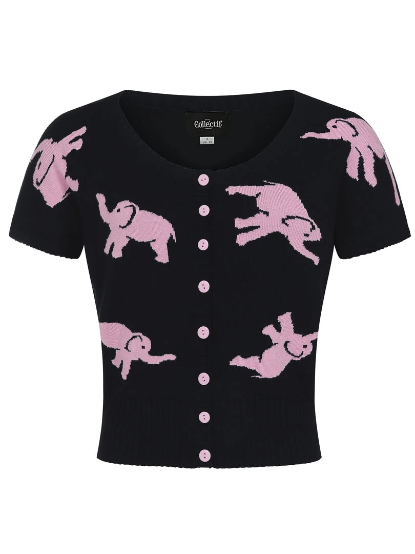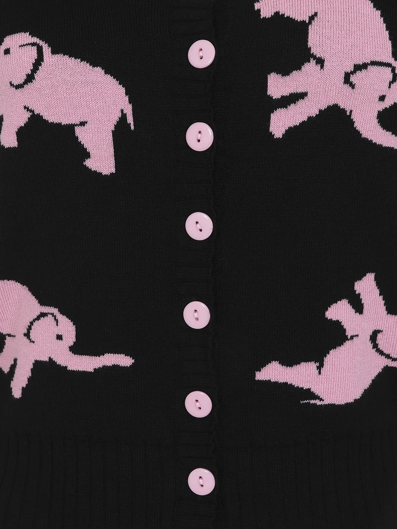 Yes, you really are seeing our Minnie Tipsy Elephants Cardigan – and isn’t it just so cute! She’s knitted from our viscose blend in black and features our bespoke design of pretty, playful pink elephants. She has a round neckline, short sleeves and a ribbed hem. She buttons up at the front with small, adorable, pink buttons. Go full Tipsy Elephant by pairing this cuteness with the matching dress and kisslock purse!