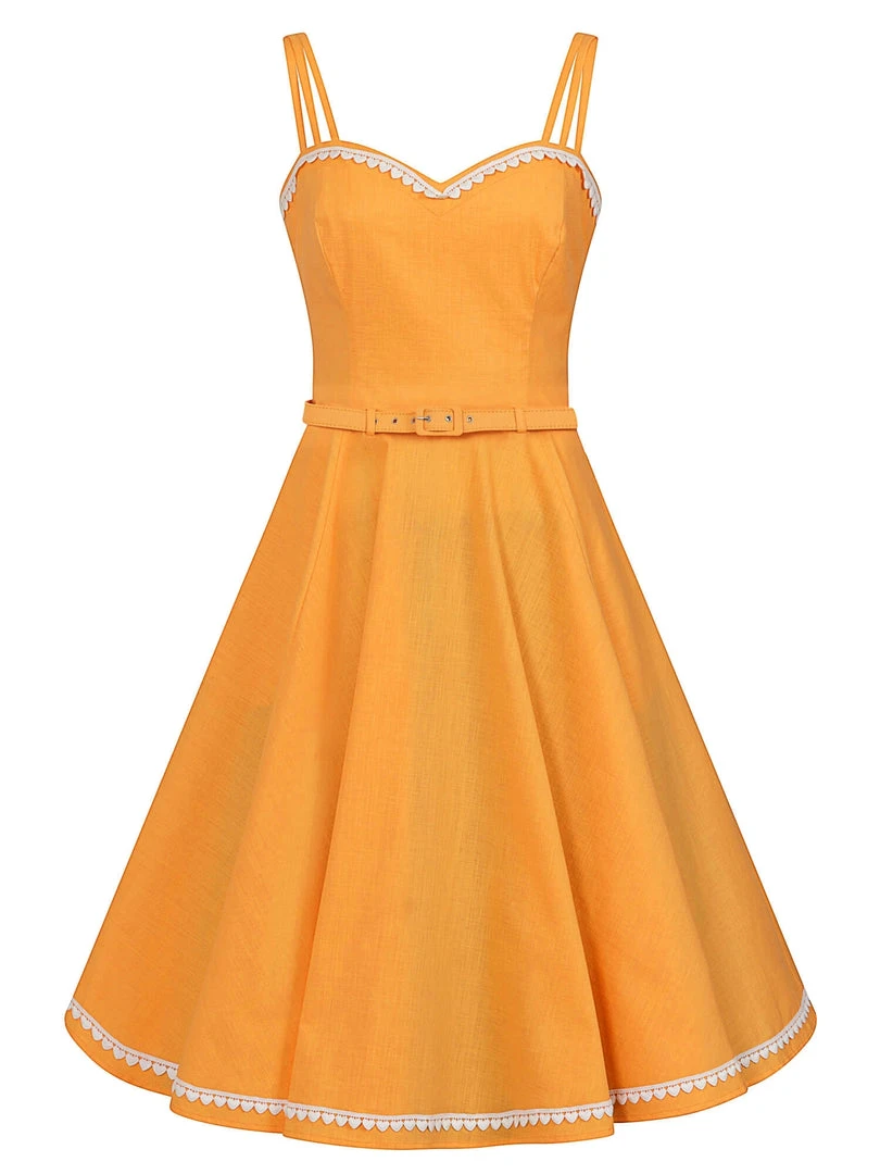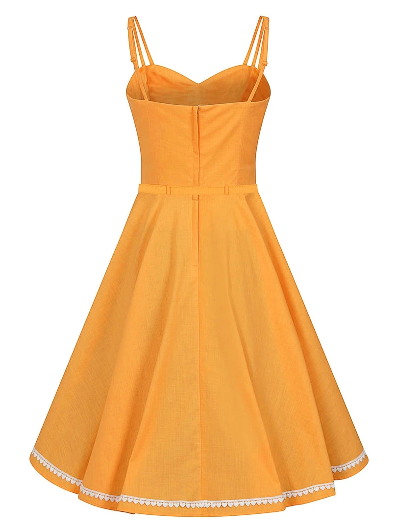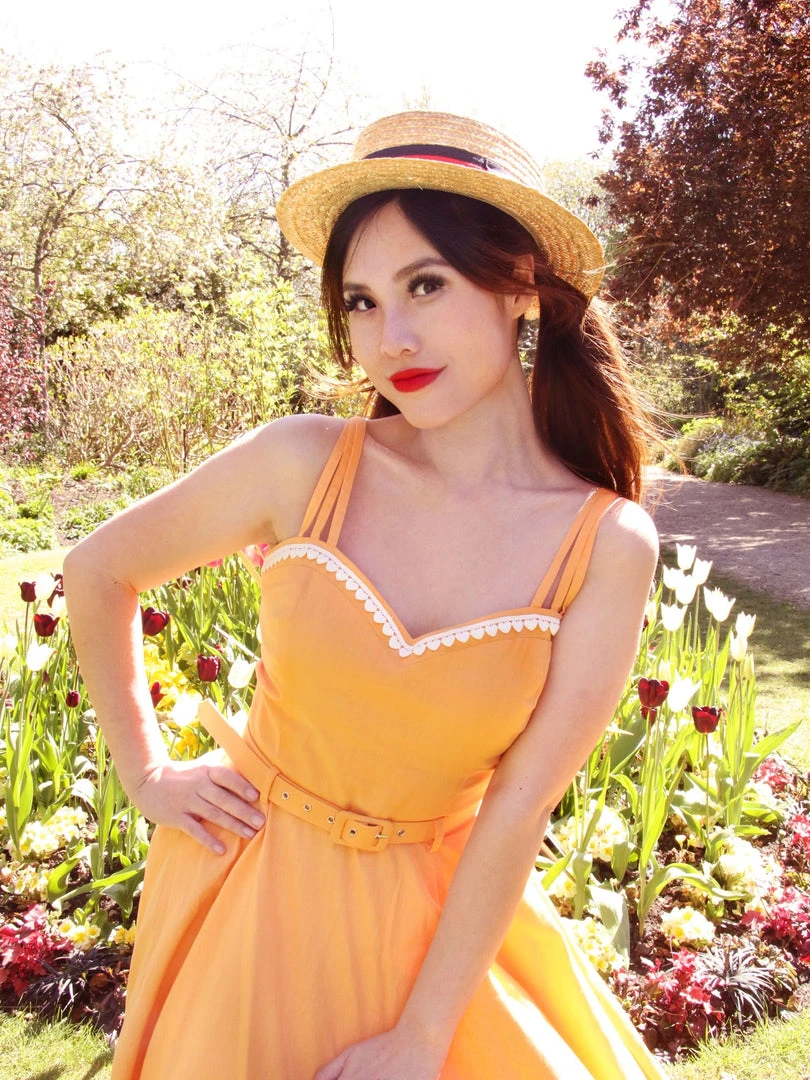 We’re all heart-eyed for our Nova Heart Trim Swing Dress! Her fitted bodice features a stunning sweetheart neck with a dinky white heart trim lining the edge, and adjustable spaghetti straps. Her skirt starts at the natural waist and falls to approximately below the knee, and is finished with white hearts just above her hem. We think Nova is perfect as is, but you could add a petticoat for more volume and shape. She even has handy side seam pockets! She’s made from a gorgeous lightweight textured cotton in a gorgeous egg yolk shade. She fastens at the middle of the back with a covered zip, and includes a matching PU backed belt.