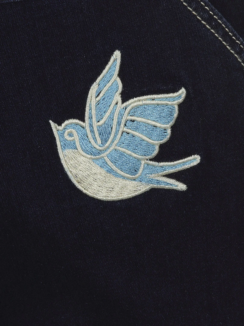 They feature two, adorable swallow embroidery patches on each hip, and the generous back pockets have pretty, swirl embroidery. Their wide waistband has belt loops which are adorned with brass coloured buttons.