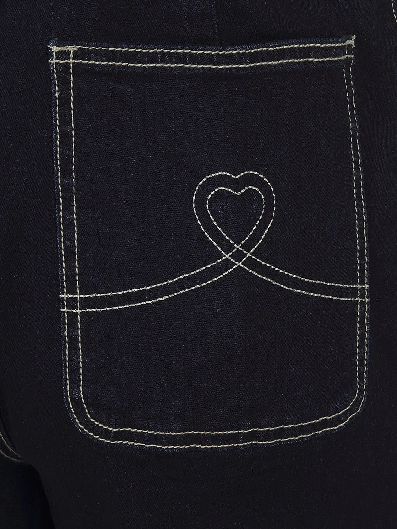 This classic denim style has a square bib with a front pocket, featuring an embroidered nautical star. The straps fasten at the bib via brass coloured buttons and clips. The trousers flare out from the hip and the fitted waistband makes for a flattering silhouette.