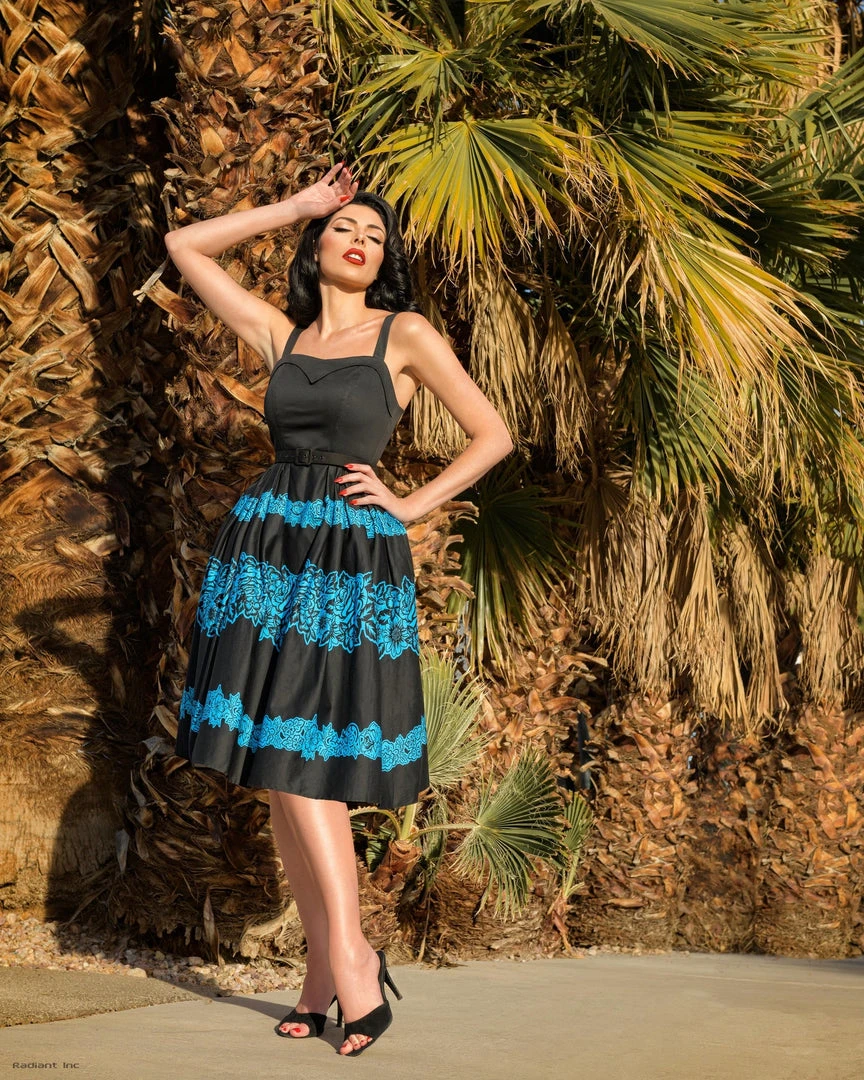 A classic 1950s style swing dress, The Flora will be a go-to spring summer staple with its cinched hourglass silhouette, adjustable straps, sweetheart bust line and full skirt gathered at the hips. Featuring a beautiful custom Blue Floral design on high quality stretch sateen cotton. This fabric is structured with 1-2 inch of stretch.