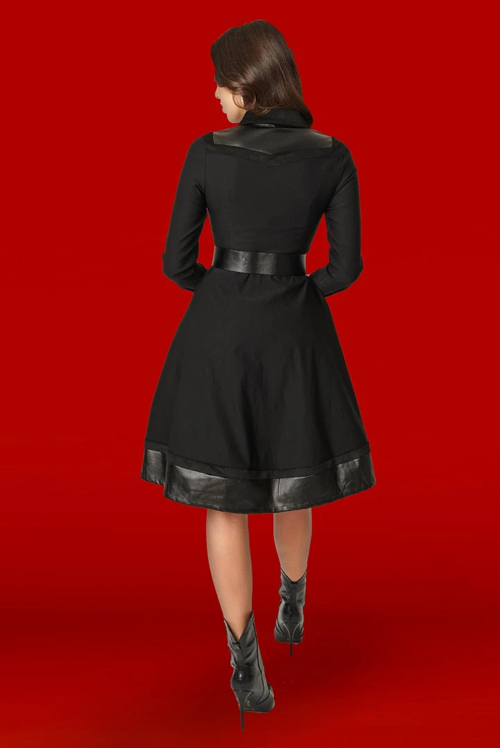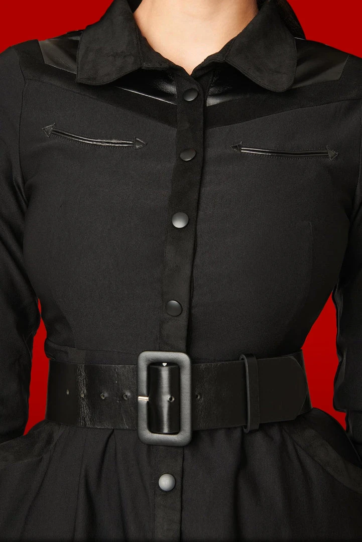Decorated with faux suede and pleather on a Bengaline fabric with matching pleather belt. The Presley features working pockets and hidden snaps to ensure it remains as secure as you want it to be. A line of matte black buttons runs from collar to hem for additional adornment.
