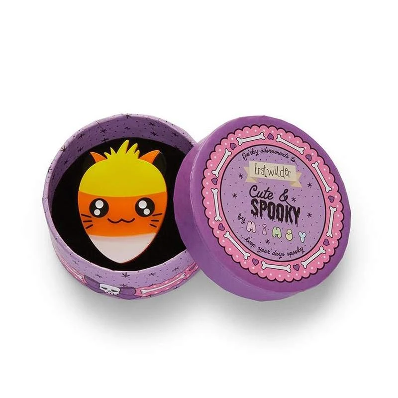 Cute as a button and twice as tasty! This cute kitty candy corn features hand-assembled details and gorgeous resins. Erstwilder X Mimsy bring tricks and treats!