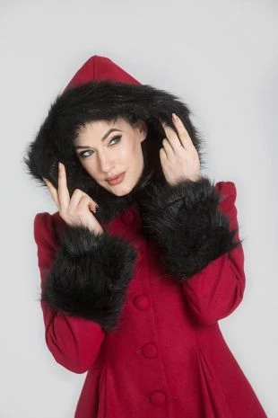 The Elvira Coat features a faux fur trimmed hood and cuffs with that gorgeous swath of faux fur at the bottom of the luxurious full skirt of the coat.