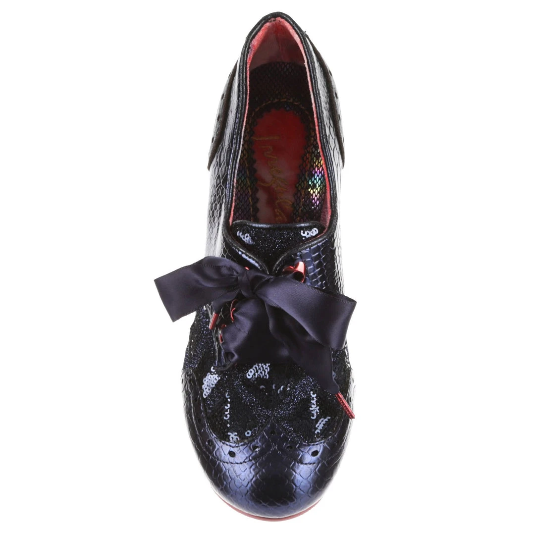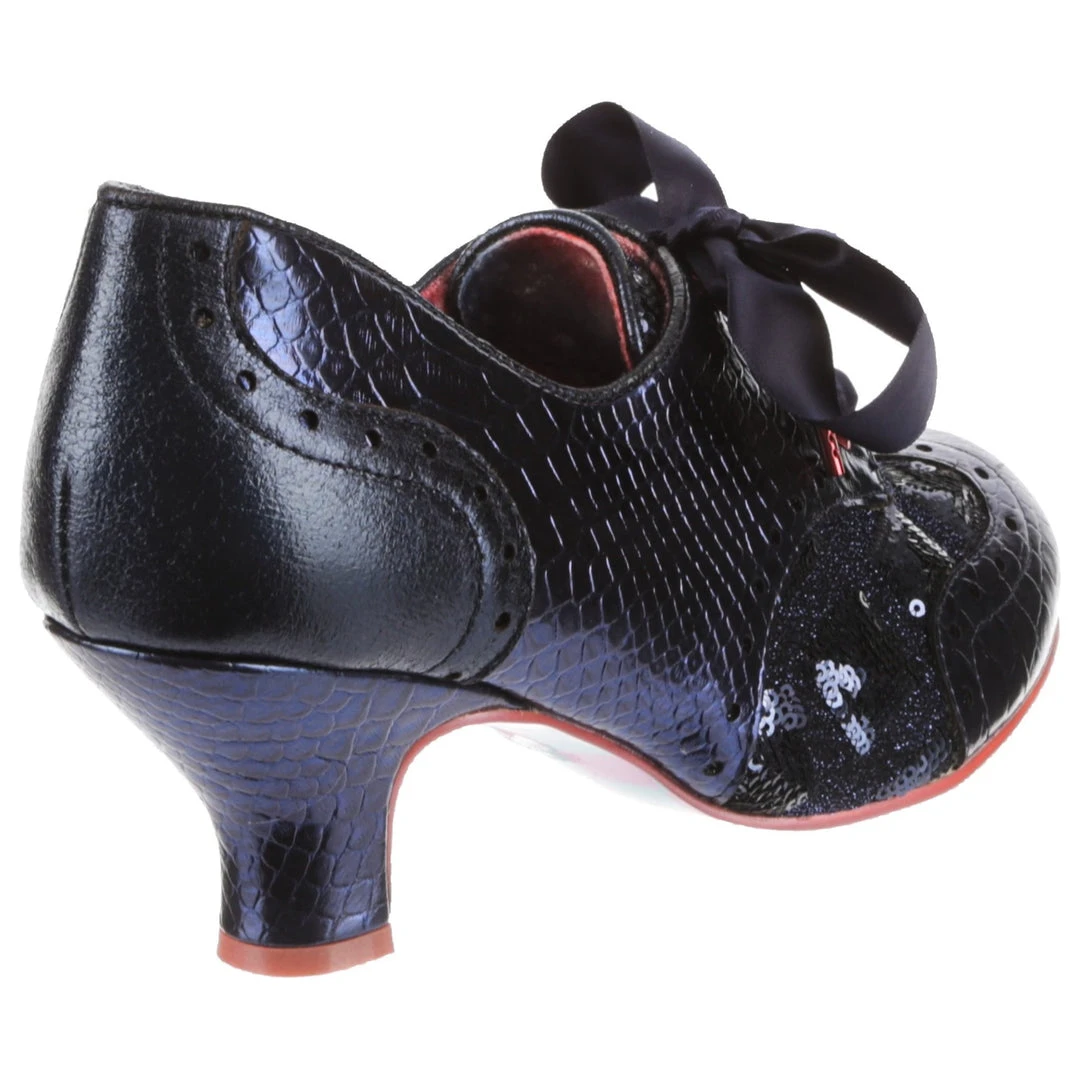 Have a Victorian adventure in these stunning lace ups! A low wearable heel is combined with luxurious blue tones of metallic, snake print and sequins. A perfect mix of textures, topped off with a contrasting rose gold edged sole and heel, navy ribbon laces and rose gold eyelets! Perfect to give any preppy look just a little extra boost!