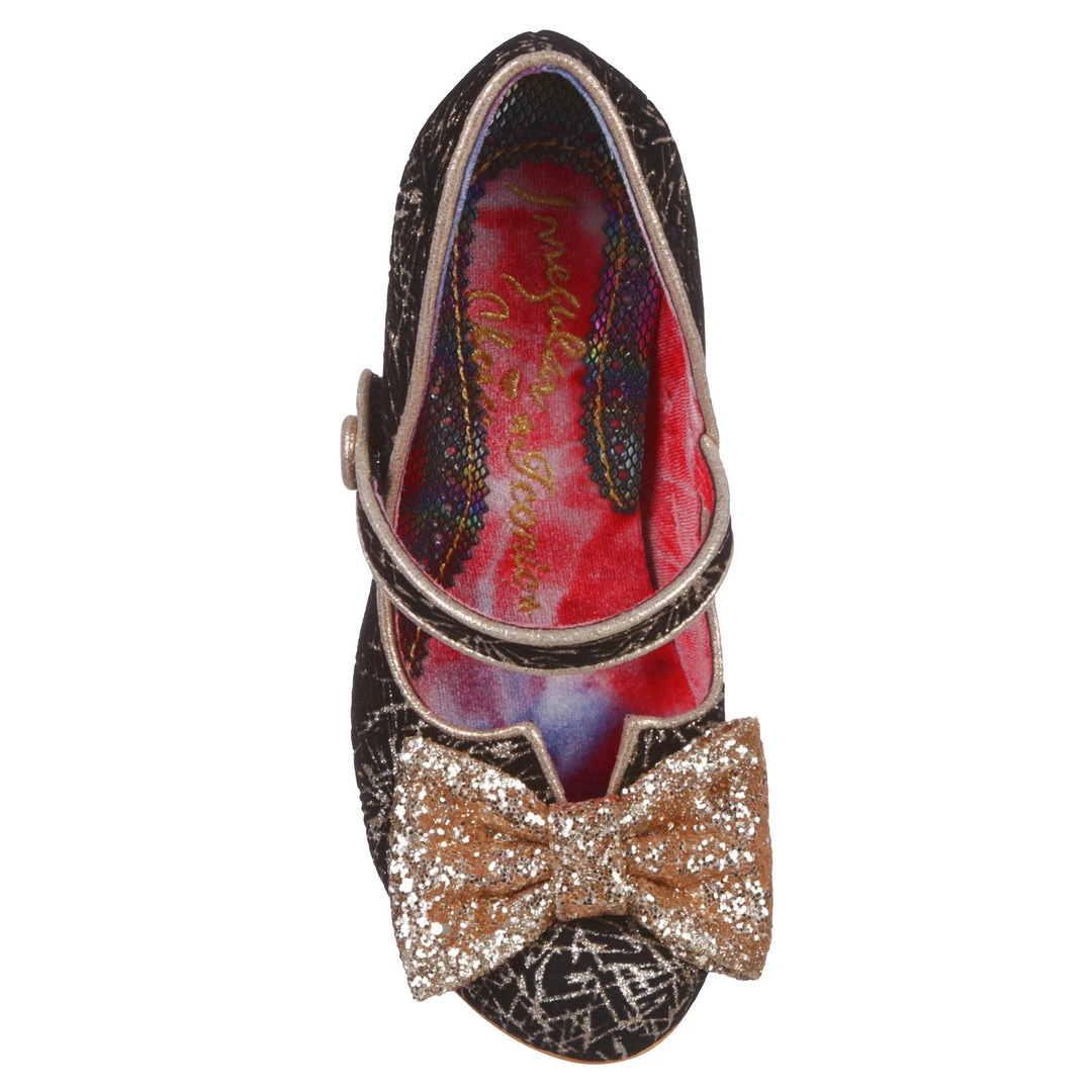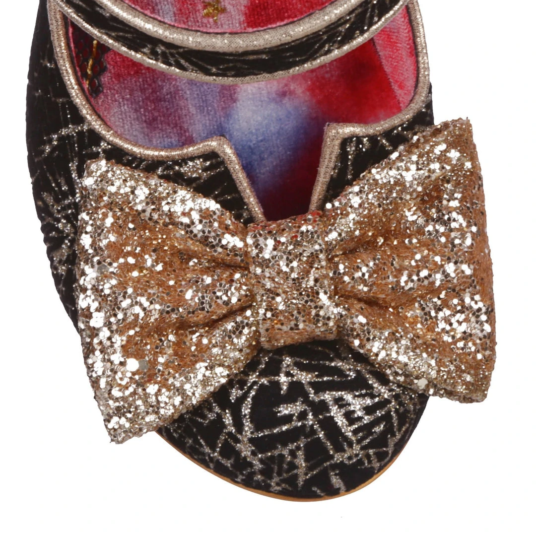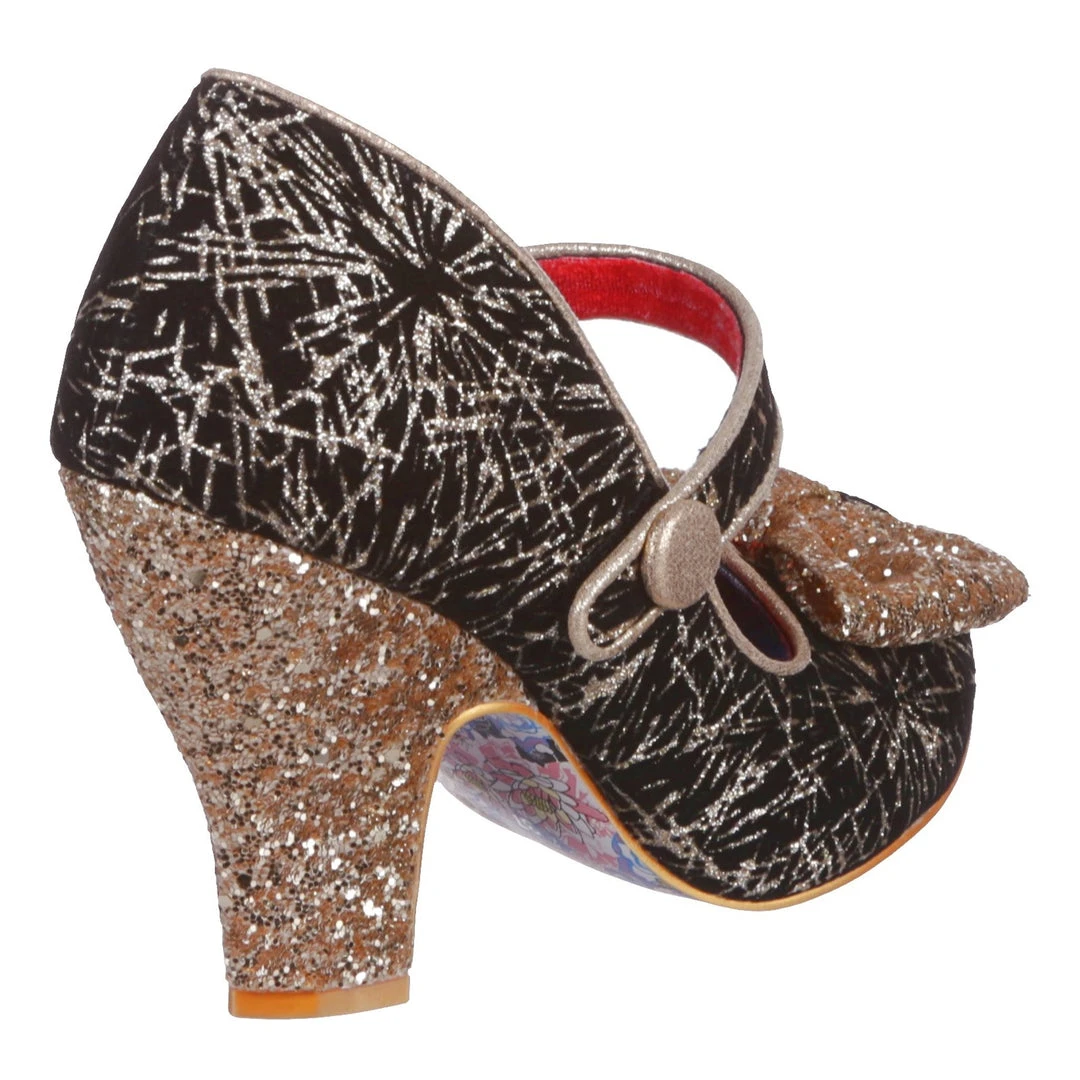 Want to add a drop of drama to your look? These high heels have a glittering personality and style by the bagful! A smashing golden metallic print is paired with a metallic glittering bow and heel, and wrapped up with a Mary Jane style strap for comfort and a splash of extra cute.