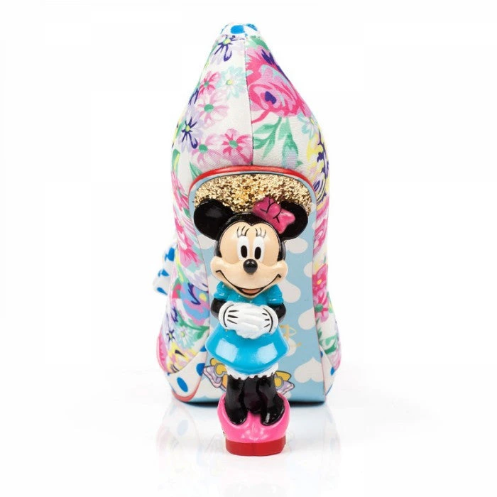 Skip with delight and embrace your inner Minnie Mouse in these super cute character heels. With a pastel floral and polka dot upper, scallop edges, a double padded bow and a glittering gold PU Minnie Mouse character heel.