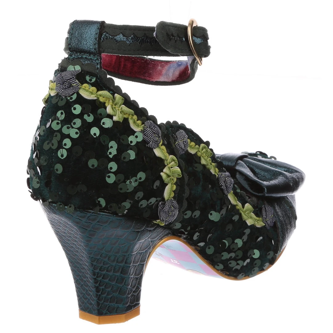 Have your own secret garden adventure in these absolutely darling heels! A green sequinned upper is adorned with creeping vines and petite grey roses. An optional ankle strap and wearable mid heel mean that these are comfortable and practical as well as cute! Topped off with metallic teal detailing on the heel, strap and front bow, these beauties are not to be missed!