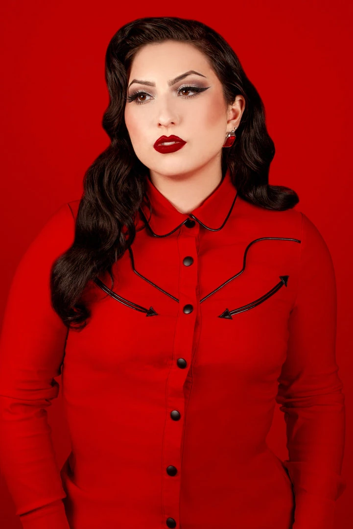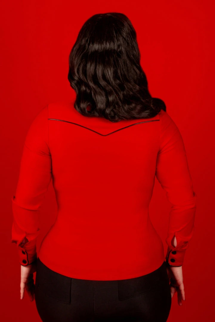 Named after country legend Patsy Cline, this chic blouse is made of a high-stretch bengaline fabric. Keeping with the classics, the top features matte black snap buttons (with extra hidden snaps to make sure everything stays where it’s supposed to) and black trim.