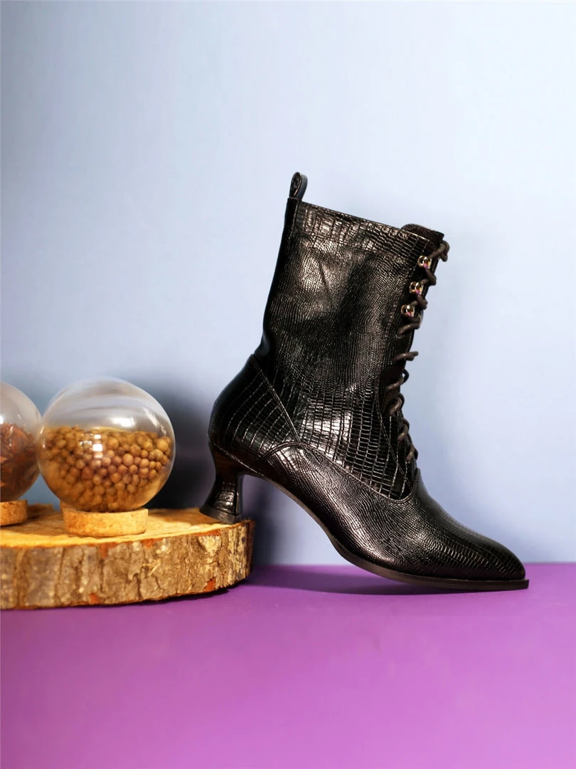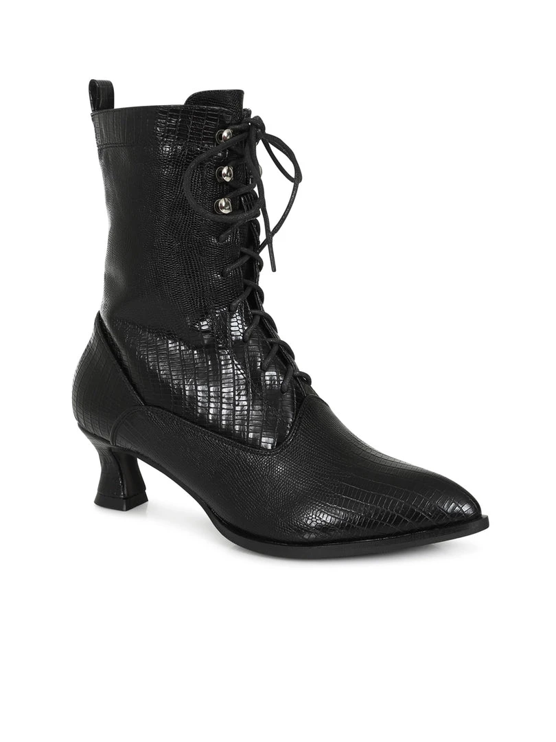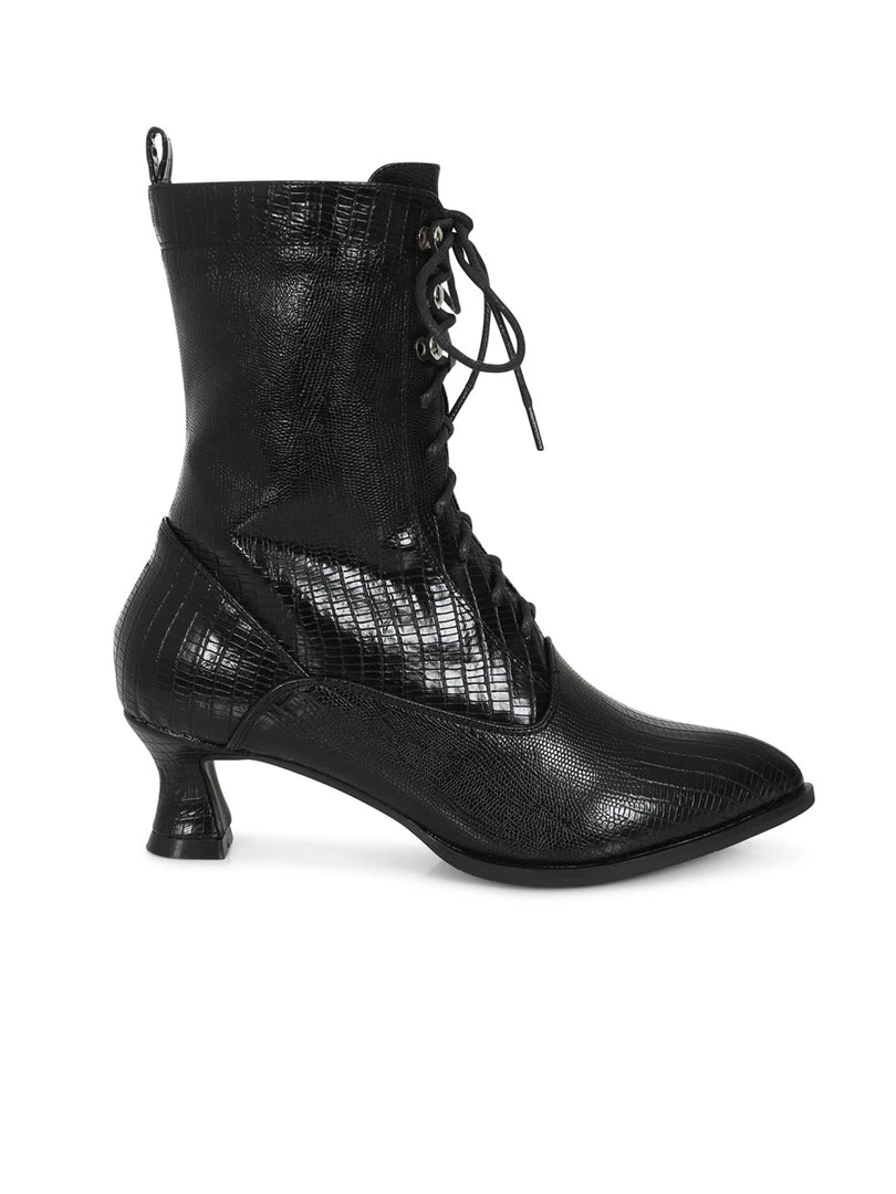Answering that nagging question – “what do I wear with my pin-up dresses in Winter?!” – The Sabrina Boots! These calf high boots are made from textured black PU that is perfect for any weather. They have a short spool heel and a classic pointed toe box, and lace up the vamp with a matching cord lace. A classic Granny Boot style that is sure to look delightful with all your dresses.