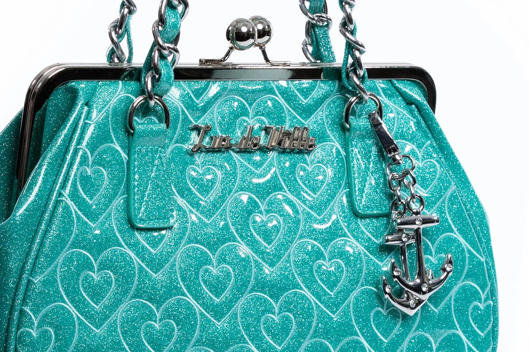 Featuring all-over heart stitching and detachable rhinestone anchor baubles, Lux Logo plate, large silver bullet feet, and chain detail on straps.