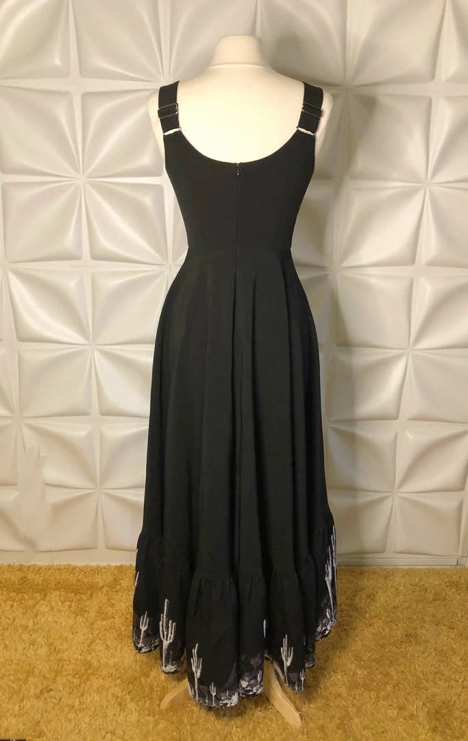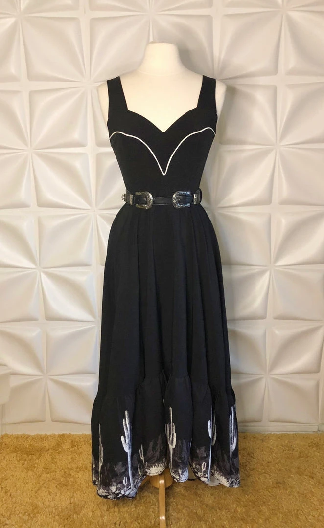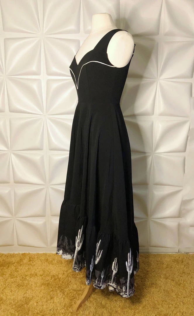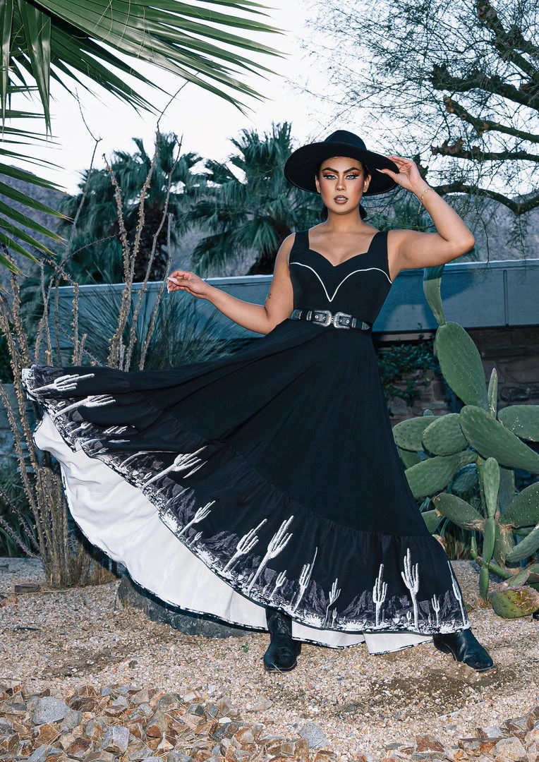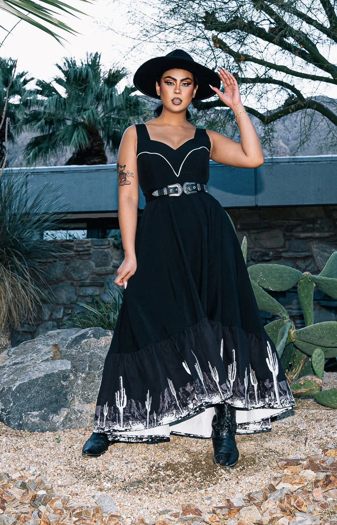 The Sonoran Desert Dress is super-flattering Western-inspired maxi dress that features white embroidery yoke, Saguaro printed ruffle hem. Beautiful weight woven material. Adjustable straps.