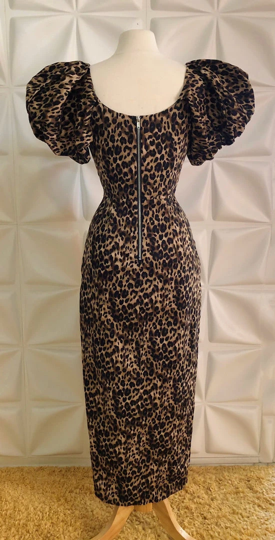 Featuring dramatic puff sleeves, full lining, and statement metal zip, this long line dress is a truly dynamic piece you will want to add to your wardrobe. Finished off with a plunging neckline and front slit – you will not go unnoticed in this sassy leopard print number!