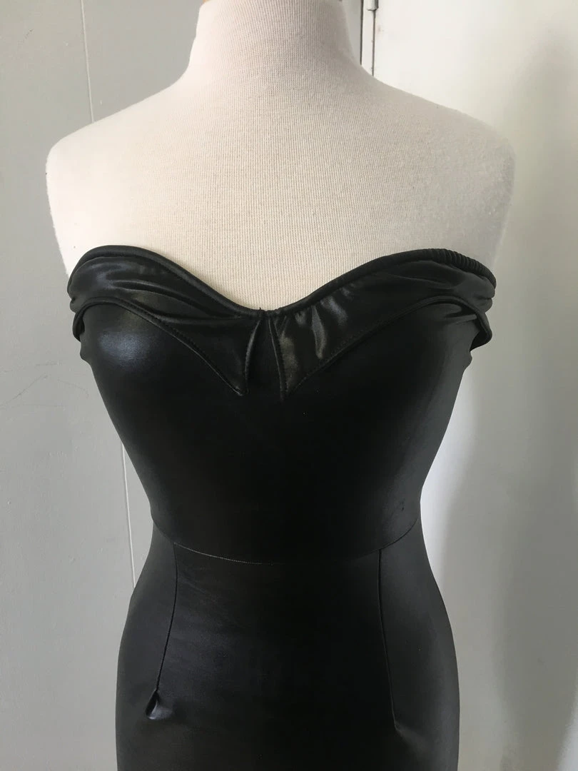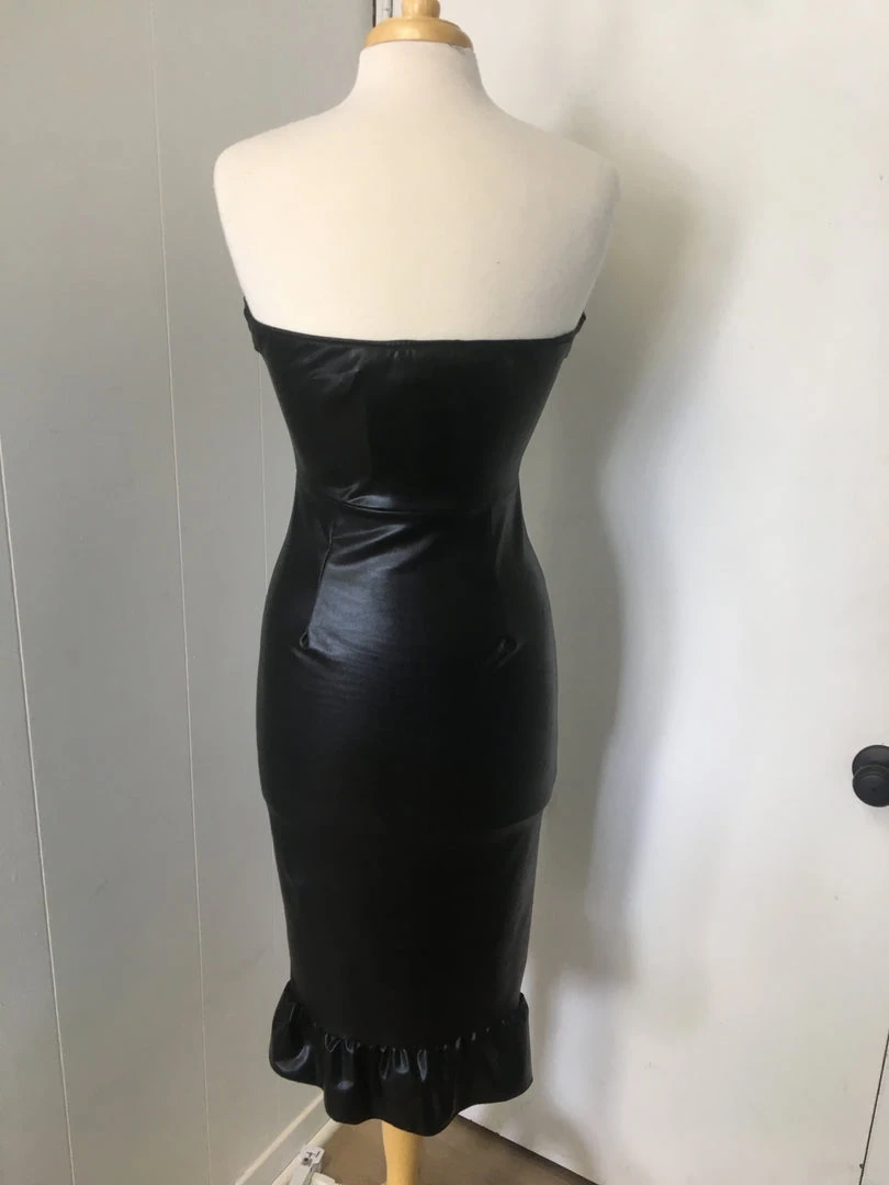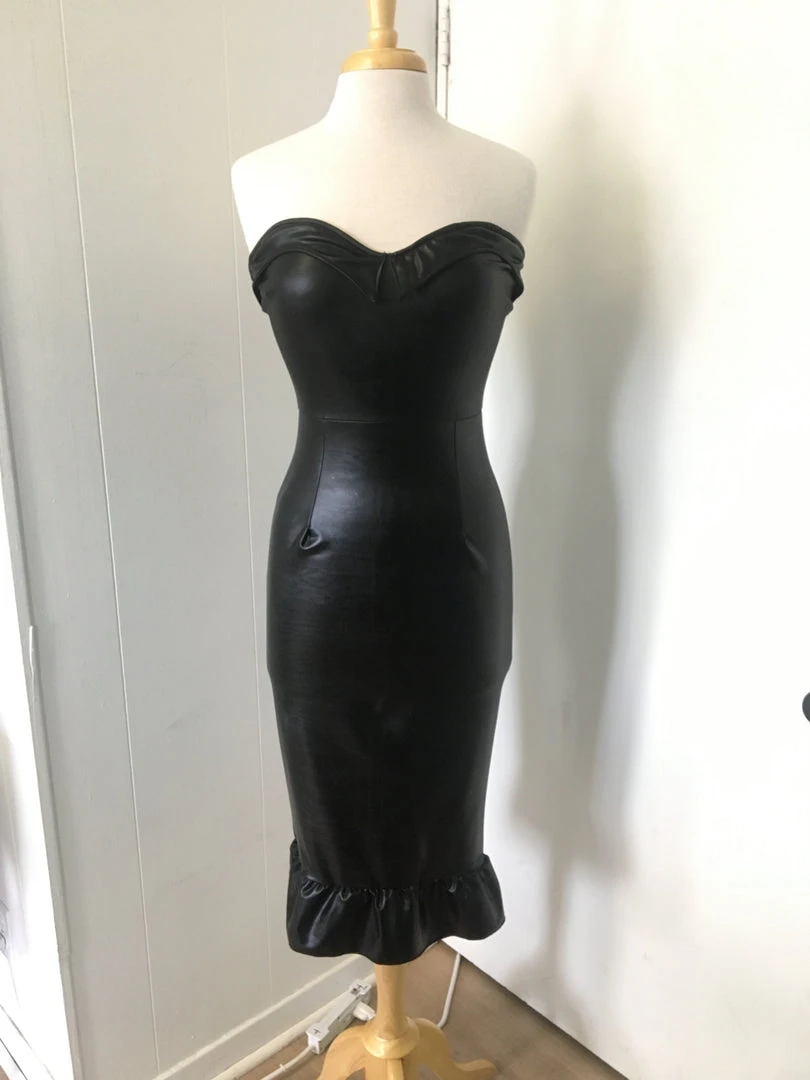 This sexy wiggle is a Suzie’s Bombshell Boutique exclusive. Made of stretchy faux-leather, it hugs every curve and flatters every silhouette.