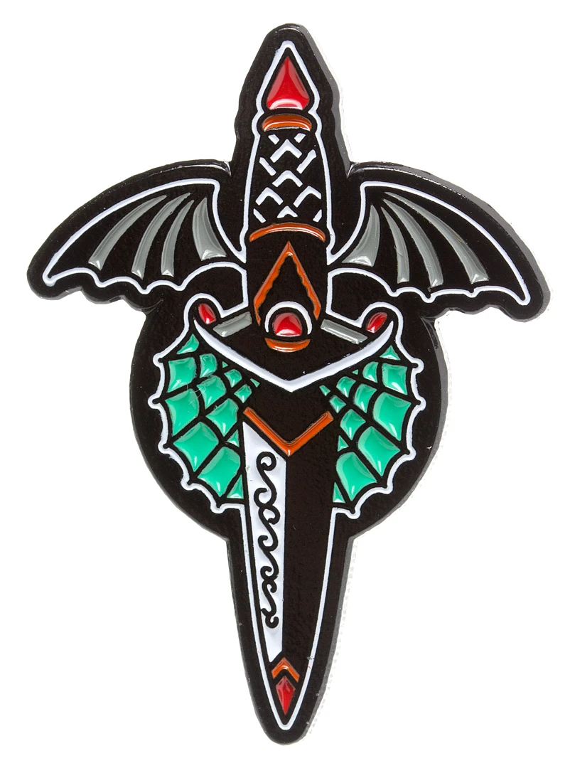 The Winged Dagger Enamel Pin is perfect for adding a traditional twist to your ensemble or accessories, featuring flash-inspired artwork that we love. Rubber clutch backing makes it easy to attach to your jacket or bag of choice.