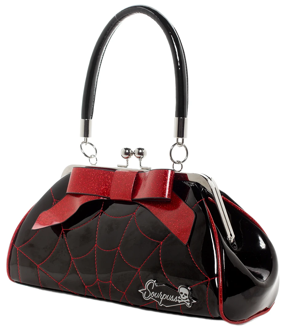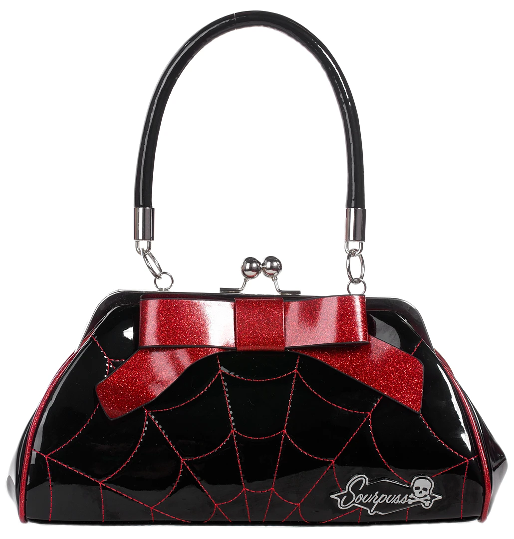 Our popular Floozy Purse is a tried-and-true classic with a vintage silhouette that’ll have you turning heads. It features all the bells & whistles that you love, such as a kiss lock closure, sturdy handles, circular metal feet and room inside for your necessities. But hold onto your hats, because we’ve updated this shiny, black bag with red spiderweb embroidery and a matching red glitter bow, that’ll have you feeling as dangerous as a black widow when it’s in your hand.
