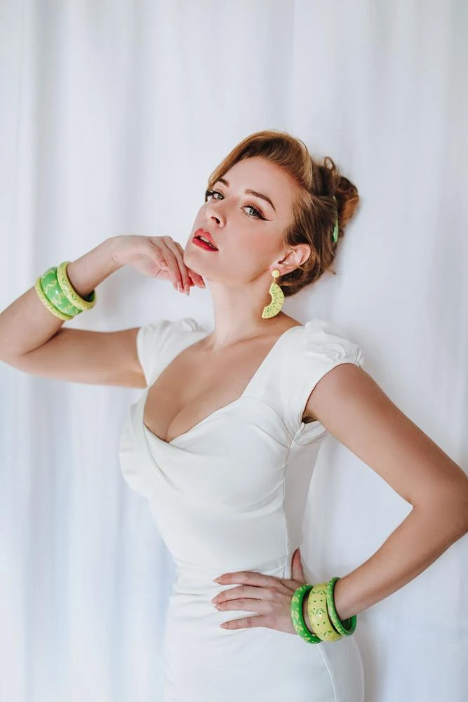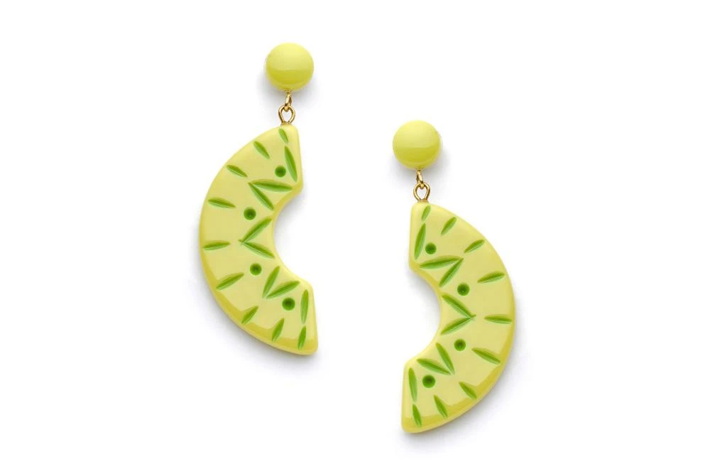 We just can’t peel our eyes off this colourway! The Zest Carved Drop Earrings are a vibrant green, designed to brighten up any vintage style outfit. Inspired by the bright colours of the 1950s, these vintage style earrings mix perfectly with Duotone buddy, Lime, and why not add in a splash of orange fakelite for a really tropical cocktail?