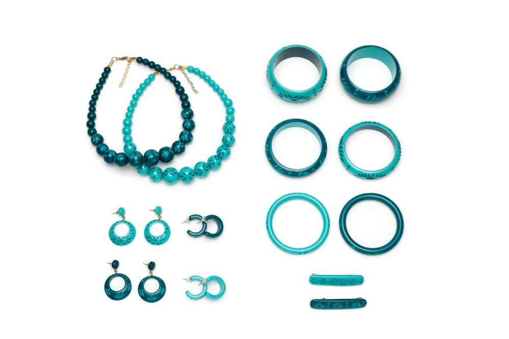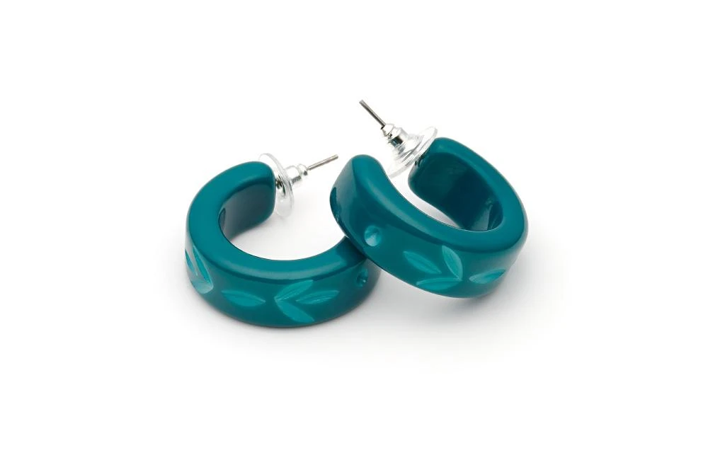 We love a bluey green! The Dragonfly Carved Hoop Earrings are no exception! Look no further if you want to add a touch of the tropics to your vintage inspired outfit. We love them with greens, we love them with pinks, and we especially love them with their Duotone partner, Nymph. Whether you are a 1940s Bakelite sweetheart or you get your kicks from 1950s kitsch, Dragonfly is going to bring that to your outfit!