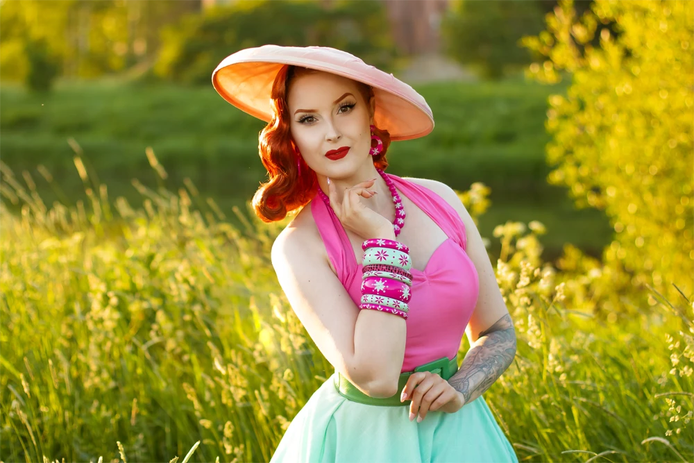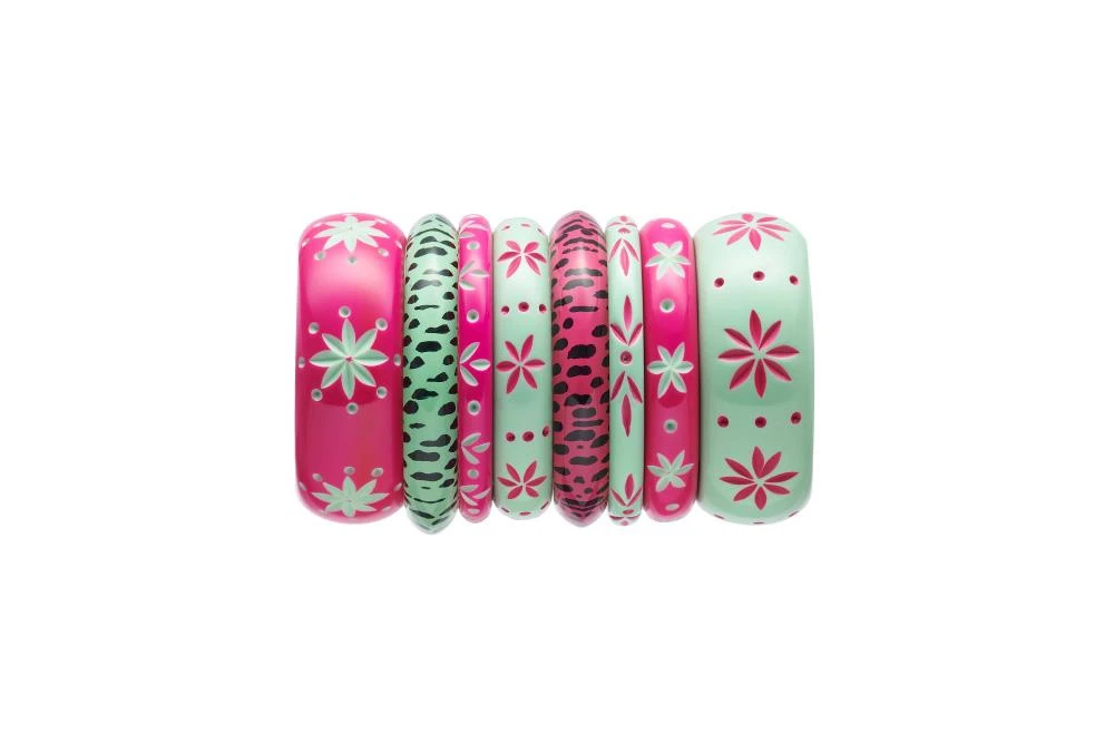 Flamingo has got us in a right flap! It doesn’t get more kitschy vintage inspired than Flamingo. Take them from your tropical paradise front lawn and adorn your ears with a pair of fakelite fabulousness. The Flamingo Carved Drop Hoop Earrings are a dreamy Duotone of bright pink with mint green.