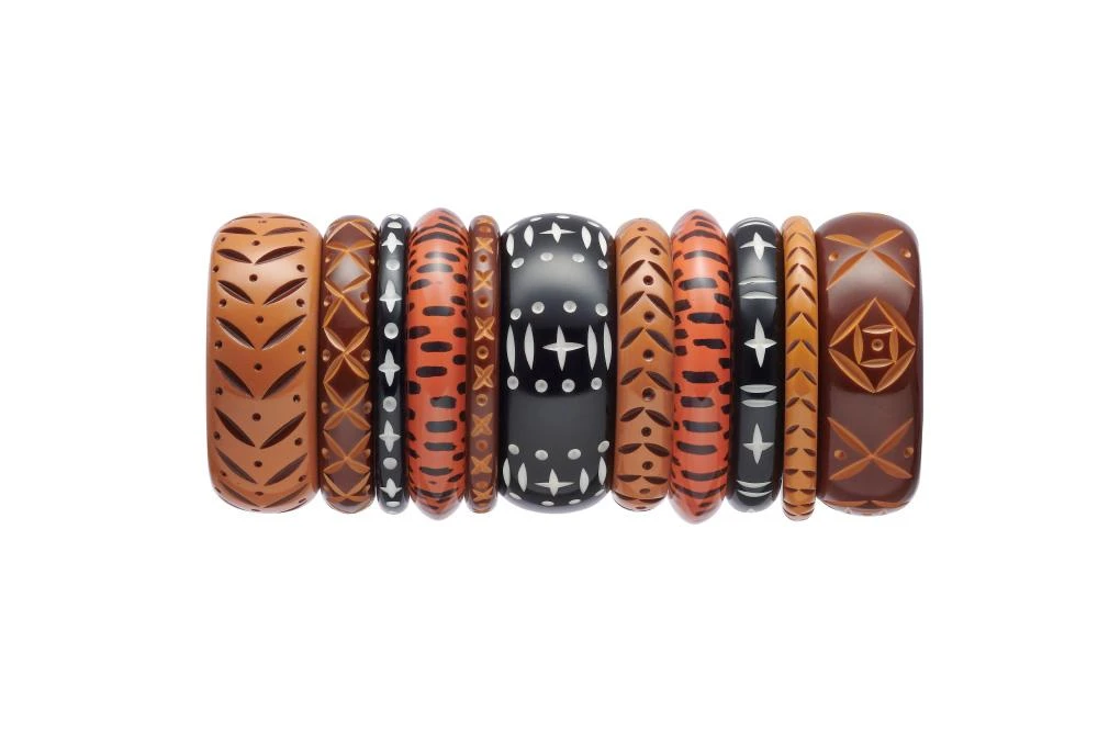 The perfect mixture of tropical vibes meets vintage western wear. Whether you’re a 1940s cowgirl on the ranch or a 1950s beach-side babe, Midi Almond is the ideal addition to your fakelite bangle stack.