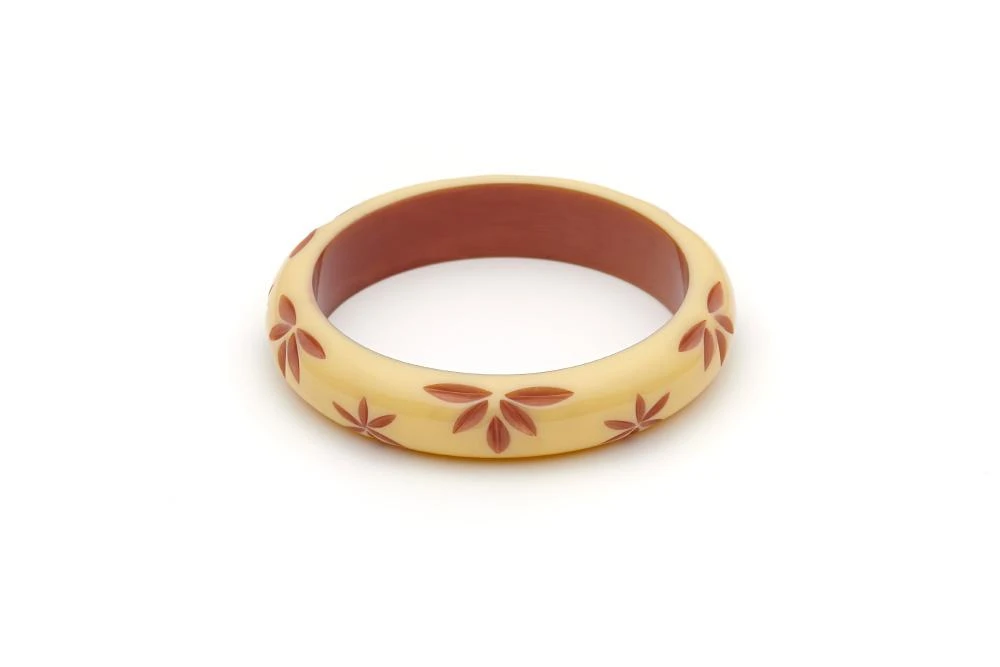 Rich and creamy, the Midi Lait Carved Bangle is 1940s Western inspired in style and, alongside Café, is the other half of the neutral Duotone partnership. Stacked together they work in sync to give an iconic vintage look. We love popping some other brown fakelite in there too for a true Bakelite inspired stack.