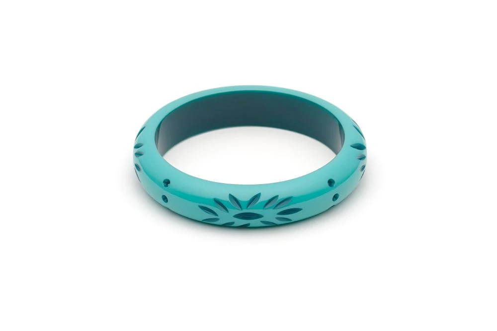 In ancient mythology, Nymphs were beautiful deities who often resided in the water. Our Midi Nymph Carved Bangle certainly has a merfolk vibe, with its gentle greeny blue colour and deeper toned carvings. Keep it aqua themed with it’s Duotone partner, Dragonfly, or take it on land with some natural woven bangles.