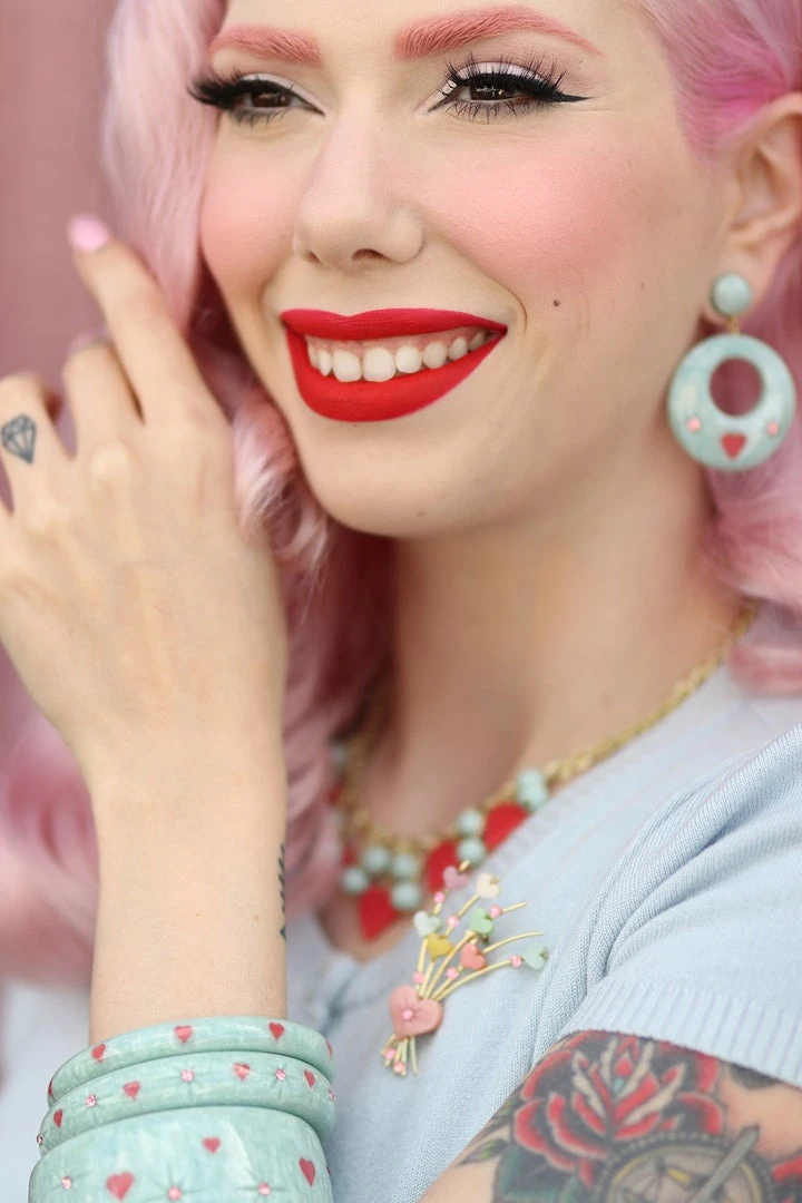 Blue and pink is just such a dreamy combo, isn’t it! The light blue Narrow Baby Doll Heart Bangle with its contrasting pink hearts, adds a perfectly pastel note to your 1950s Valentines stack.