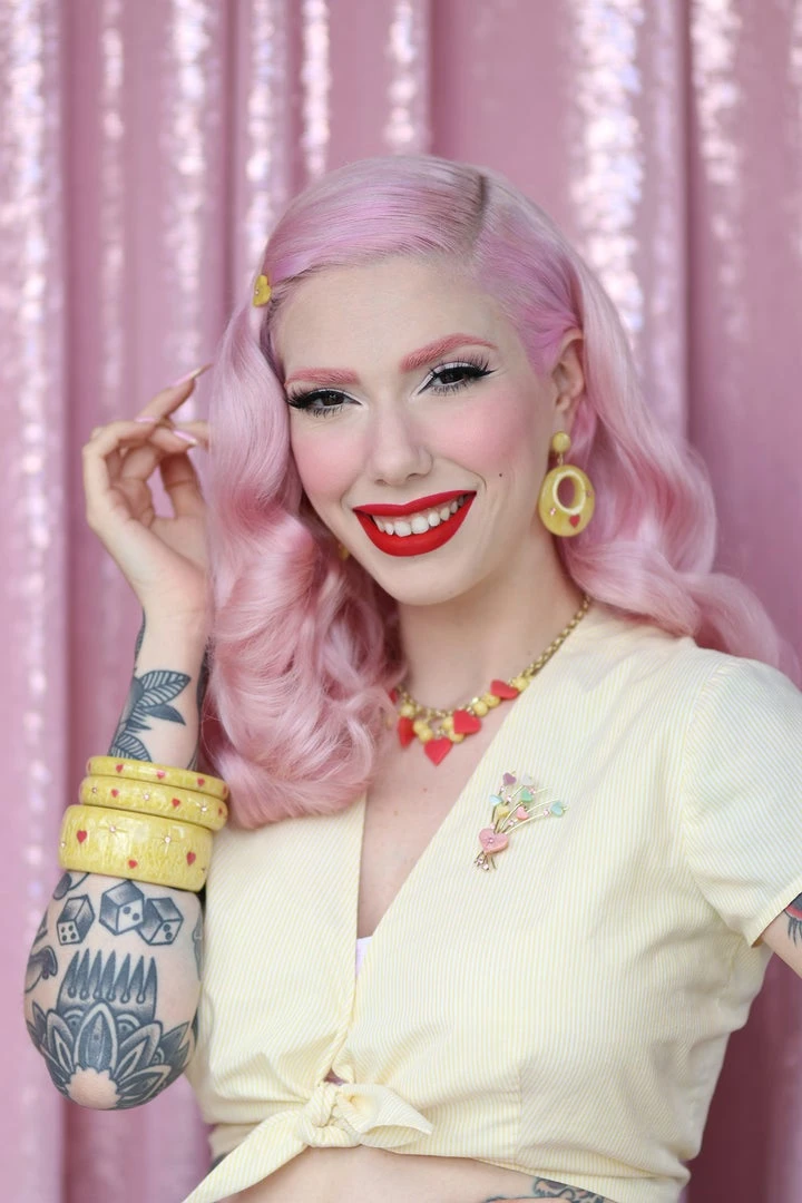 We are buzzin’ about this colour! A gloriously sunshiney yellow, the Extra Wide Honey Bunch Starburst Bangle has 1950s style carvings and pink hearts for a kitsch kick.