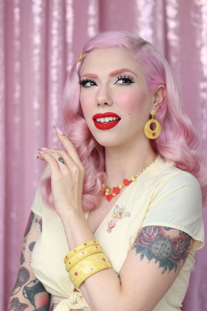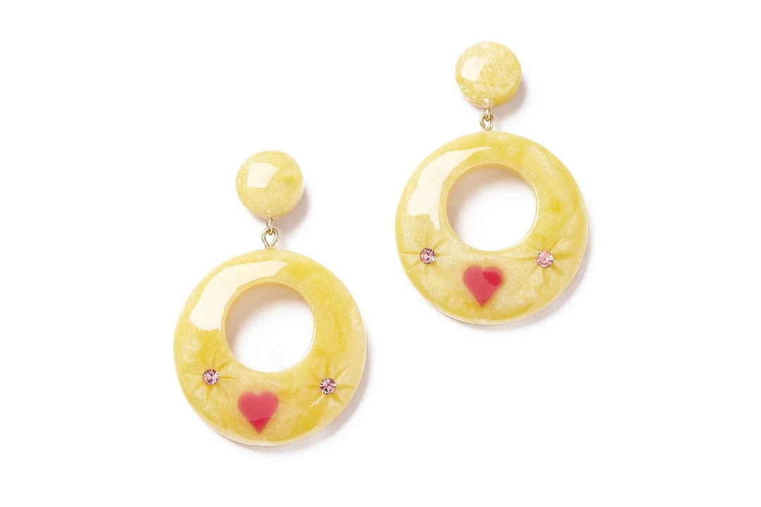 We are buzzin’ about this colour! A gloriously sunshiney yellow, the Honey Bunch Starburst Earrings have 1950s style carvings and pink hearts for a kitsch kick.