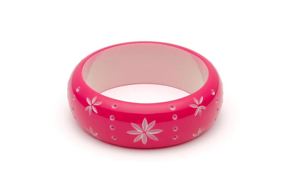 Bursting with colour, the Wide Raspberry Carved Bangle is a beautiful addition to your pinktastic 1950s stack. The delicate petal carvings mixed with the vibrant berry colour means Raspberry is ideal for both fruity and floral stacks, or keep it simple with its ice-cream parlour pal, Ripple, for a scrumptious vintage style combo.