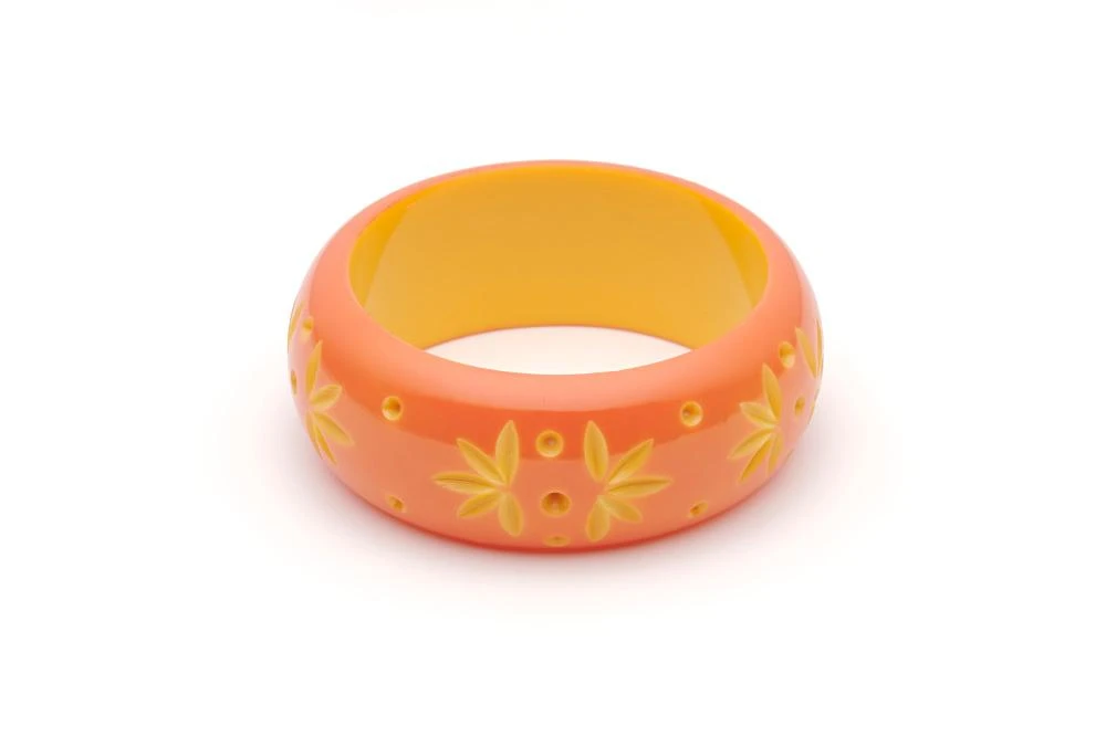 A little splash of springtime sunshine, the Wide Freesia Carved Bangle is a soft peach with delicate yellow carvings. This Duotone bangle is instant happiness in fakelite form. For a really retro 1950s look, team the Wide Freesia Carved Bangle with a sprig of Honeysuckle or two, or make it a fruity number with a pop of Raspberry.