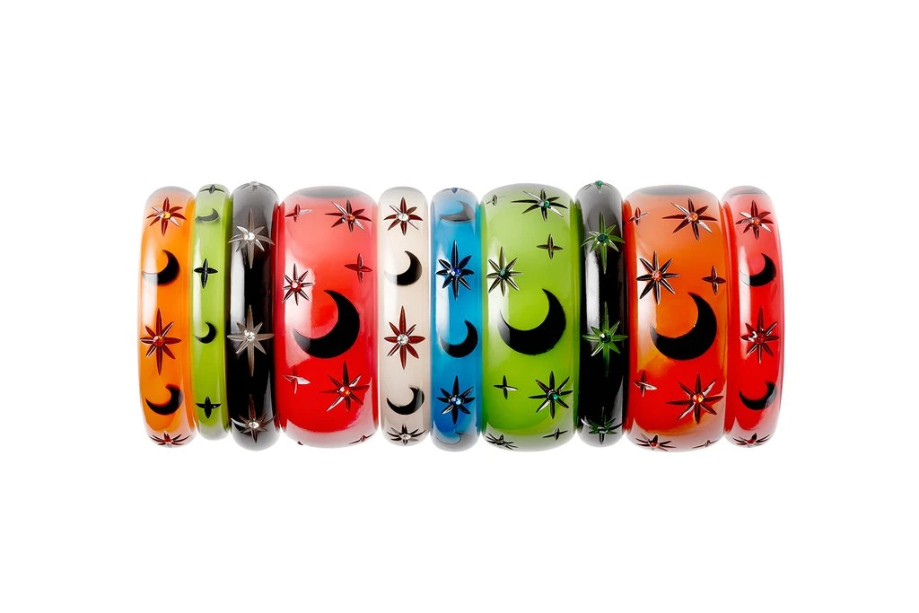 The Wide Wolf Moon Bangle is a supernatural blue with black moon and starburst details to give this bangle a retro Halloween twist. And it gets better! This entire Halloween collection glows in the dark! Charge up the jewellery and glow get ’em, ghouls!