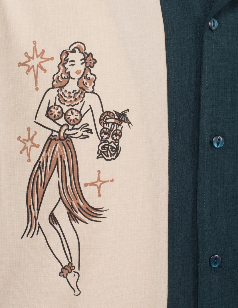 That’s no mirage, that’s a real life tiki bowling shirt! The Mai Tai Mirage Button Up features an atomic-style tiki pinup holding a tiki mug printed on a contrast color single panel. This shirt is breathable enough to wear by the pool, sipping on mai tais and relaxing the day away.