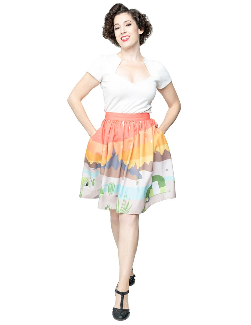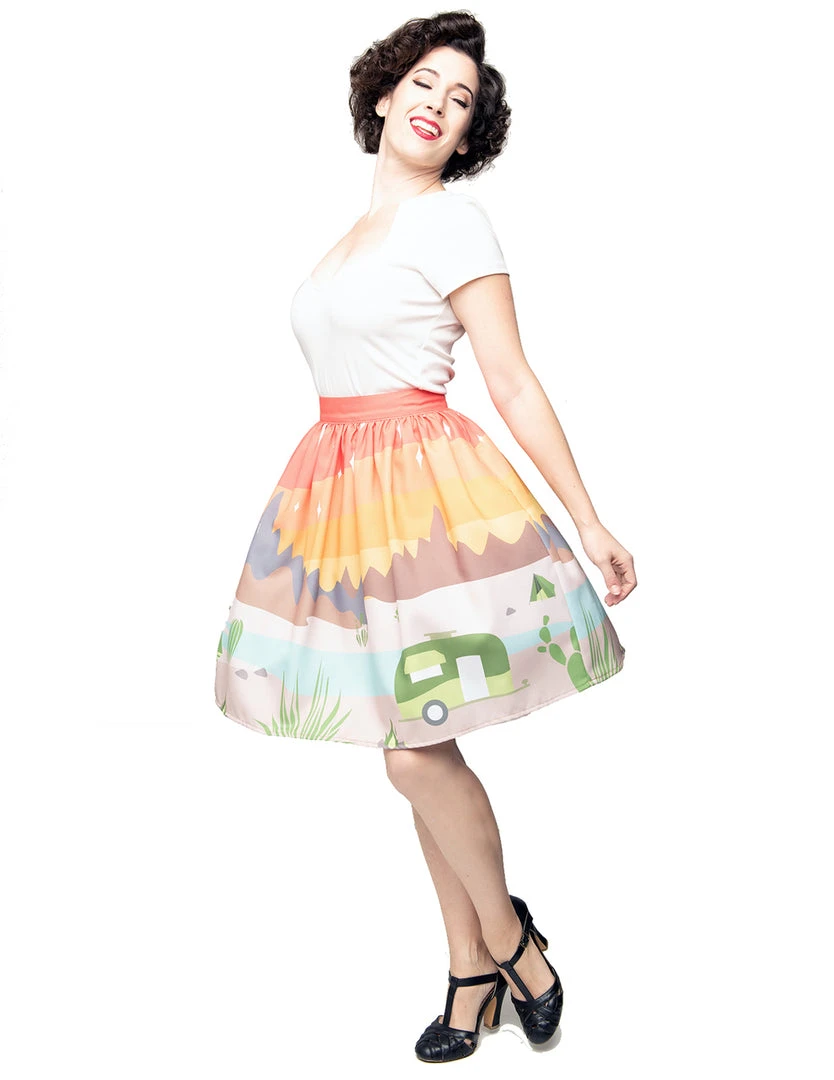 Get ready to hit the road and blaze new trails in this vintage camper and desert scene print skirt!