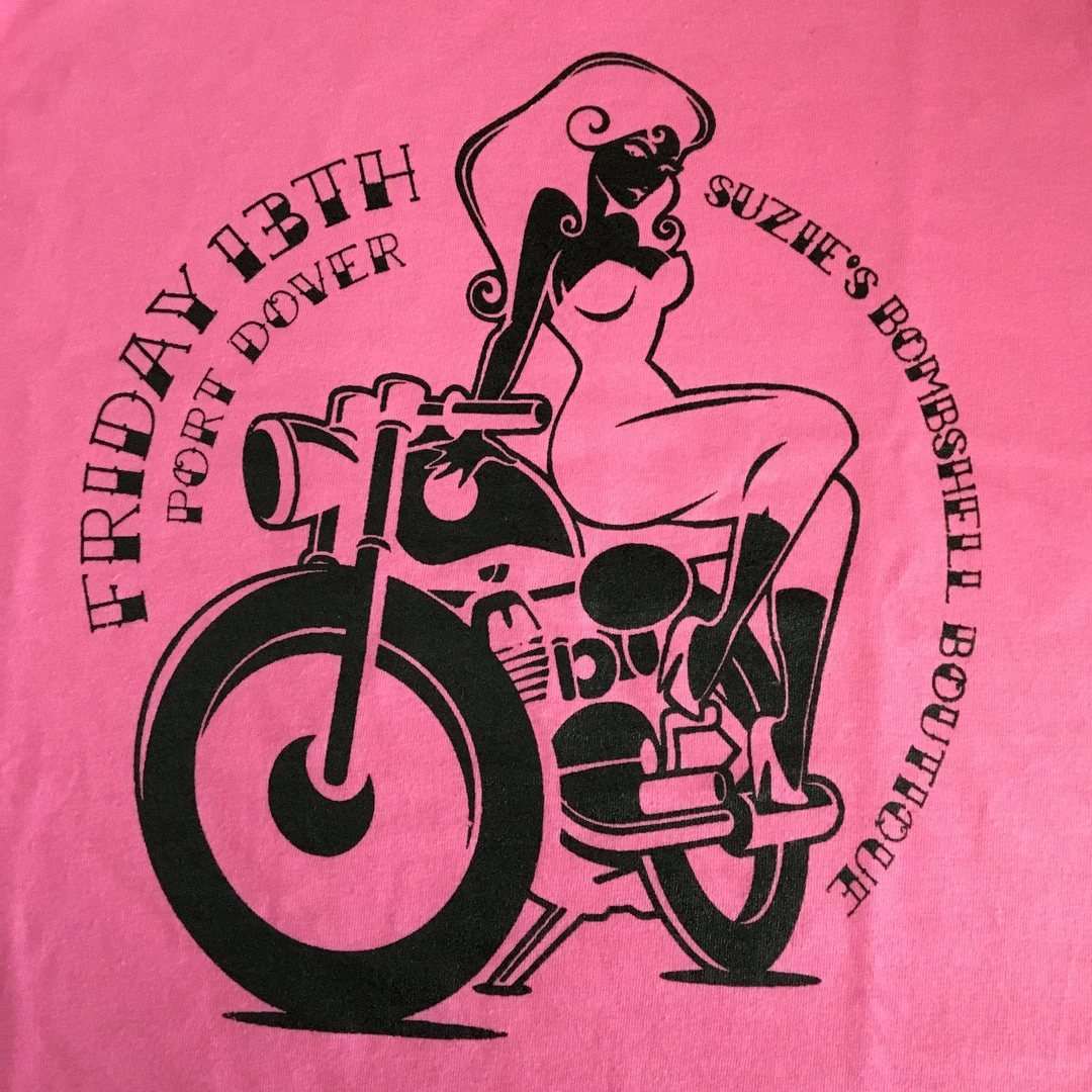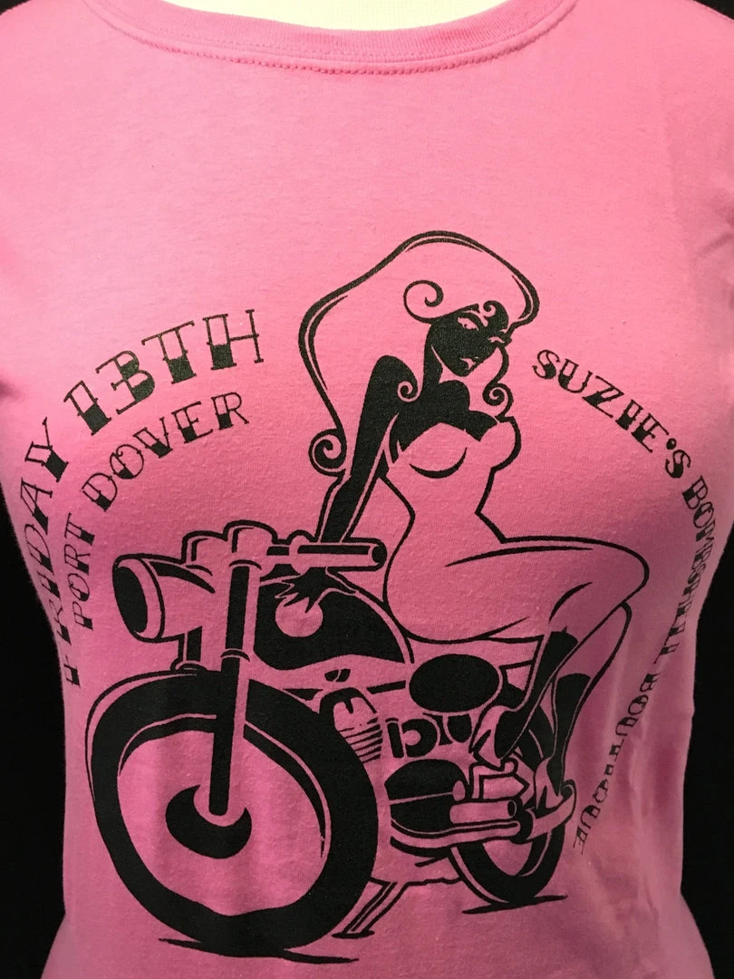 Get your biker girl on in Suzie’s Bombshell Boutique’s very own Friday the 13th logo tee! Now in pink!