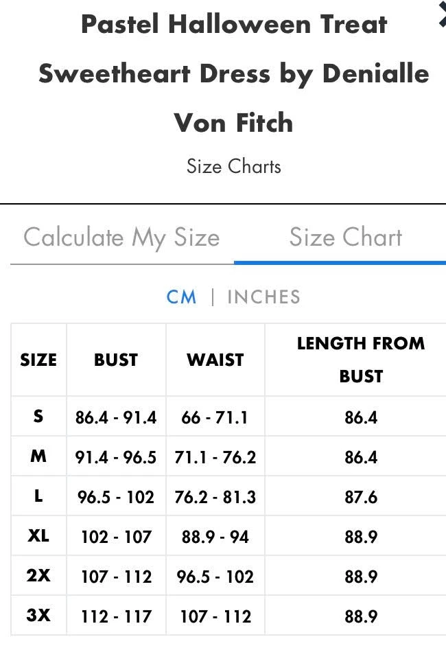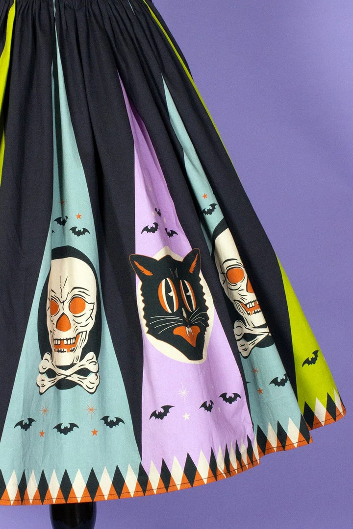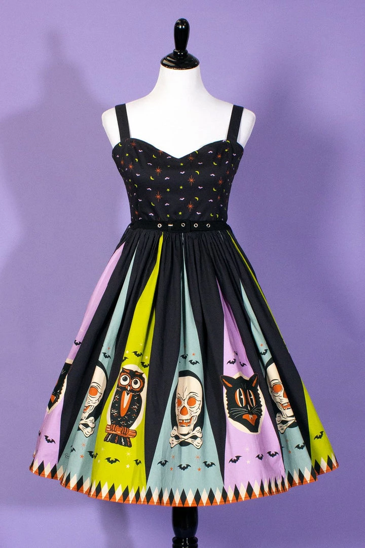 The Halloween Treat Sweetheart Dress by California designer Denialle Von Fitch features a full, gathered skirt emblazoned with spooky skeleton, creepy owl, and curious cat and a fitted bodice in a fun bat, moon and starburst print.