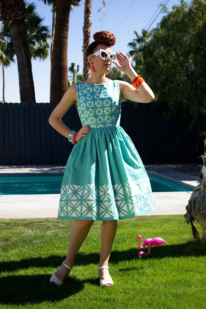 This dress is all the Palm Springs 50s vibes! Featuring crisp and cool 100% cotton, adorable boatneck styling, a gathered waist, and pockets – this dress will become your summer favourite.