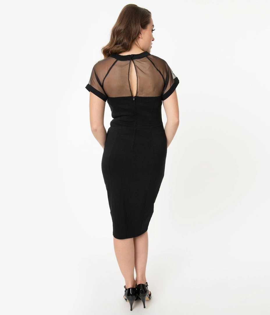 Ring their bells, dears! A stirring silhouette for a cultured lady, the Beaulieu Dress from Unique Vintage is crafted in a sensational Burgundy red stretch blend for a whiplash inducing 1960s figure. The princess seamed sweetheart bodice boasts an elegant sheer neckline in exquisite poly organza that gathers at the banded high neck and curves to the back, secured with a button keyhole and framed by sweet short sleeves. The seamed waist centers your figure as the jaw-dropping pencil curves to a straight hem below the knees. Outfitted with a back zipper to nip in your hourglass, we hear you loud and clear!