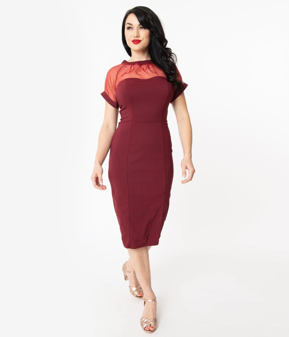 Ring their bells, dears! A stirring silhouette for a cultured lady, the Beaulieu Dress from Unique Vintage is crafted in a sensational Burgundy red stretch blend for a whiplash inducing 1960s figure. The princess seamed sweetheart bodice boasts an elegant sheer neckline in exquisite poly organza that gathers at the banded high neck and curves to the back, secured with a button keyhole and framed by sweet short sleeves. The seamed waist centers your figure as the jaw-dropping pencil curves to a straight hem below the knees. Outfitted with a back zipper to nip in your hourglass, we hear you loud and clear!