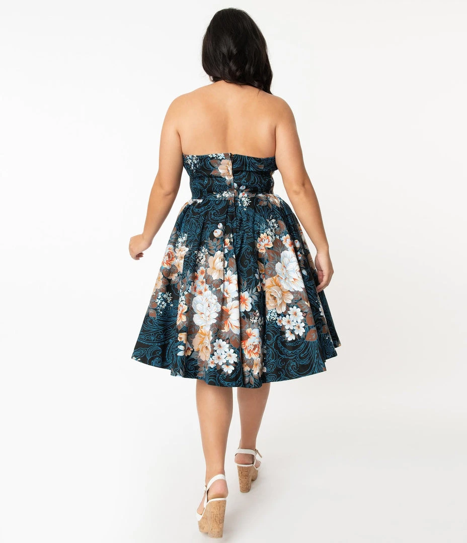 You’re the new vintage goddess, dames! A gorgeous swing dress from Unique Vintage, the Orchard Dress is a midcentury floral style featuring a gorgeous blue, white, and brown floral print cascading through and navy blue and black backdrop.. The subtle sweetheart bust is embellished with adorable pleating and is subtly boned for added support while the smocked sides allow for a perfect fit. A sweet halter strap can be easily removed with darling buttons on the bodice. Seamed at the waist, the gathered swing skirt boasts an array of pleating for added flare as it cascades to a straight hem at the knees. Bring on the high tides and good vibes!