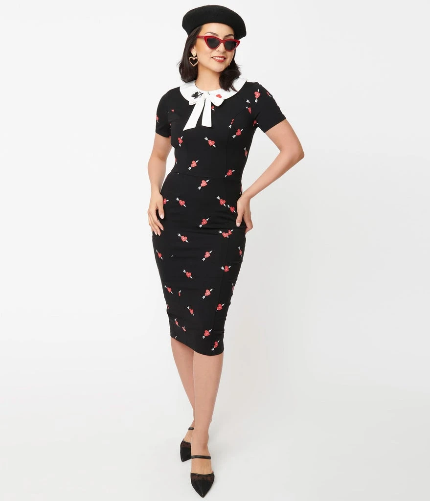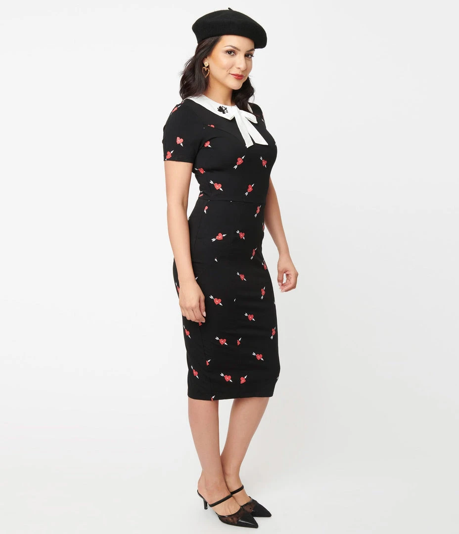 Don’t apologize for putting yourself first, dames! An unstoppable piece from Unique Vintage, the Renata Dress is a stunning silhouette in black stretch knit with a flirtatious red heart with piercing arrows printed throughout. Designed with a princess seamed and paneled form to hug your feminine curves and show off your hourglass, a dramatic white Peter Pan collar tops the modest neckline and is embellished with a cupid and heart embroidered patch, centered by a darling bow tie while sweet short sleeves keep you comfortable. Outfitted with a back zipper and back vent for sultry struts, your potential is endless!