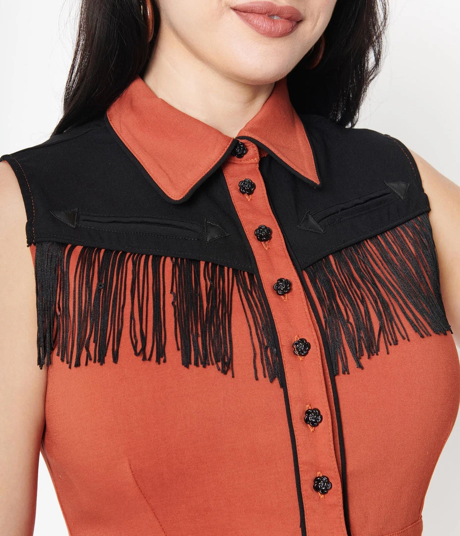 Crafted in a dark rust red bengaline stretch fabric with black fringe accents on the bust and shorts. The partial button up front leads to a classic collar while the western style yoke boasts a sleeveless design, while the banded waist is cinched with the button up front.